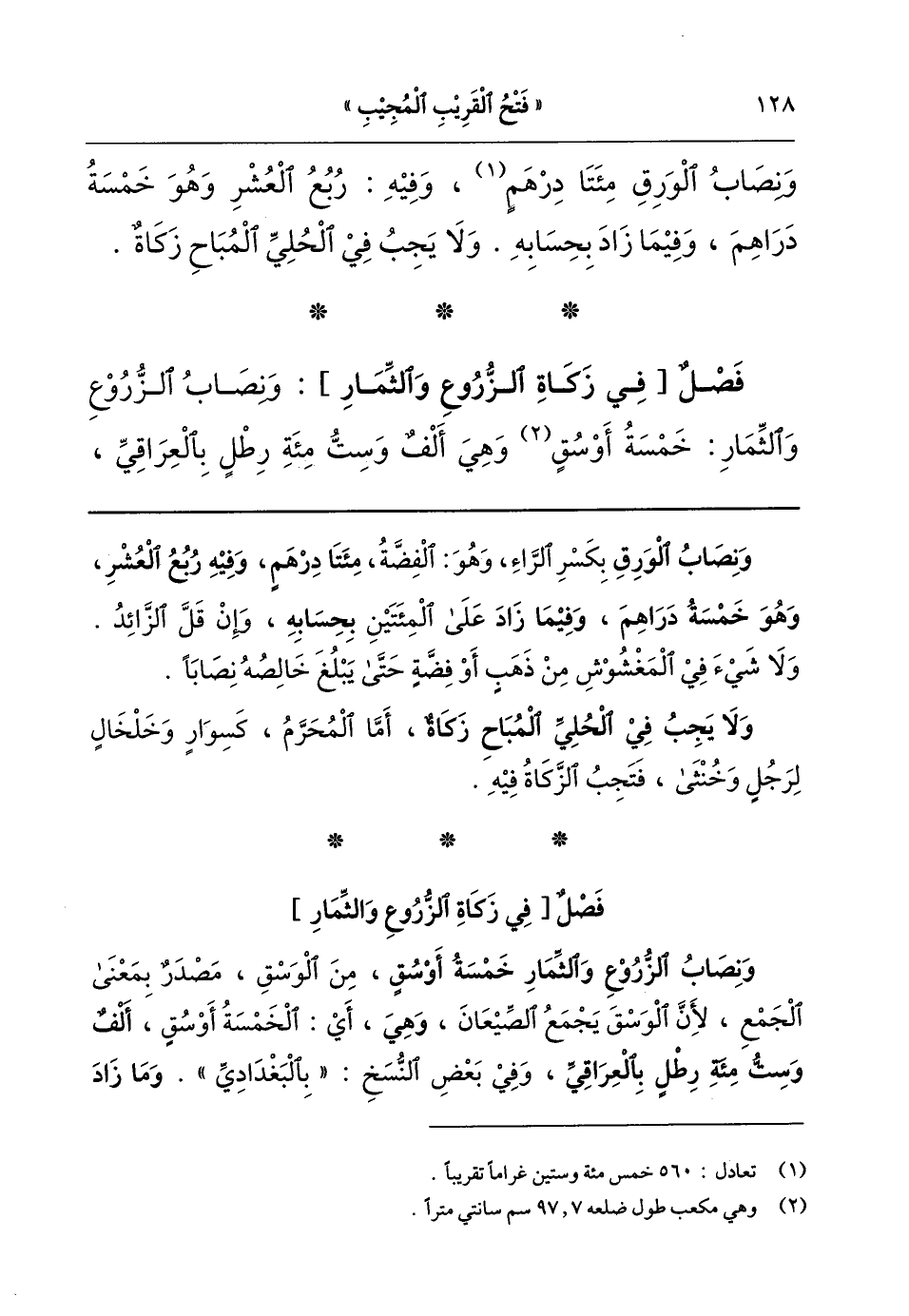 {فصل} (ونصاب الزروع والثمار خمسة أوسق) من الوسق، مصدر بمعنى الجمع، لأن الوسق يجمع الصيعان، (وهي) أي الخمسة أوسق (ألف وستمائة رطل بالعراقي)؛ وفي بعض النسخ «بالبغدادي»، (وما زاد