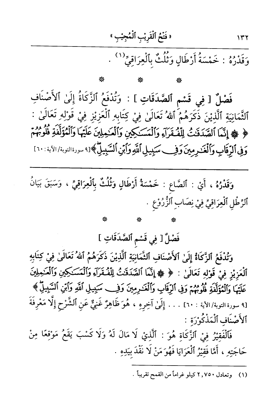 {فصل} (وتدفع الزكاة إلى الأصناف الثمانية الذين ذكرهم الله تعالى في كتابه العزيز في قوله تعالى: {إِنَّمَا الصَّدَقَاتُ لِلْفُقَرَاءِ وَالْمَسَاكِينِ وَالْعَامِلِينَ عَلَيْهَا وَالْمُؤَلَّفَةِ قُلُوبُهُمْ وَفِي الرِّقَابِ وَالْغَارِمِينَ وَفِي سَبِيلِ اللَّهِ وَابْنِ السَّبِيلِ} [التوبة: 60]، هو ظاهر غني عن الشرح إلا معرفة الأصناف المذكورة. فالفقير في الزكاة هو الذي لا مال له ولا كسب يقع موقعا من حاجته؛ أما الفقير العرايا فهو من لا نقد بيده.