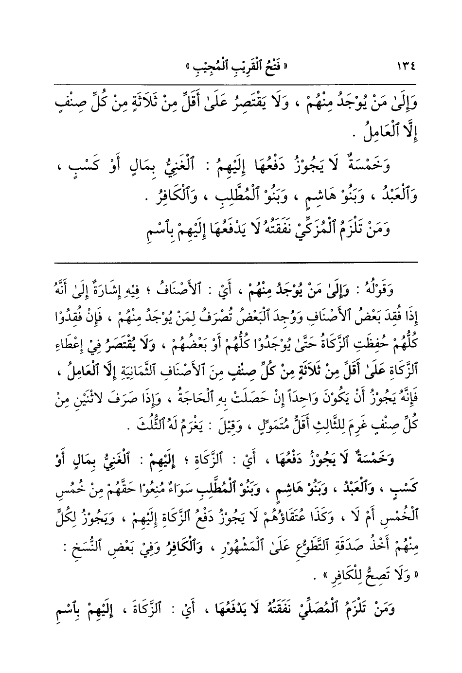 (وخمسة لا يجوز دفعها) أي الزكاة (إليهم: الغني بمال أو كسب، والعبد، وبنو هاشم، وبنو المطلب) سواء منعوا حقهم من خمس الخمس أم لا، وكذا عتقاؤهم لا يجوز دفع الزكاة إليهم. ويجوز لكل منهم أخذ صدقة التطوع على المشهور، (والكافر). وفي بعض النسخ «ولا تصح للكافر».