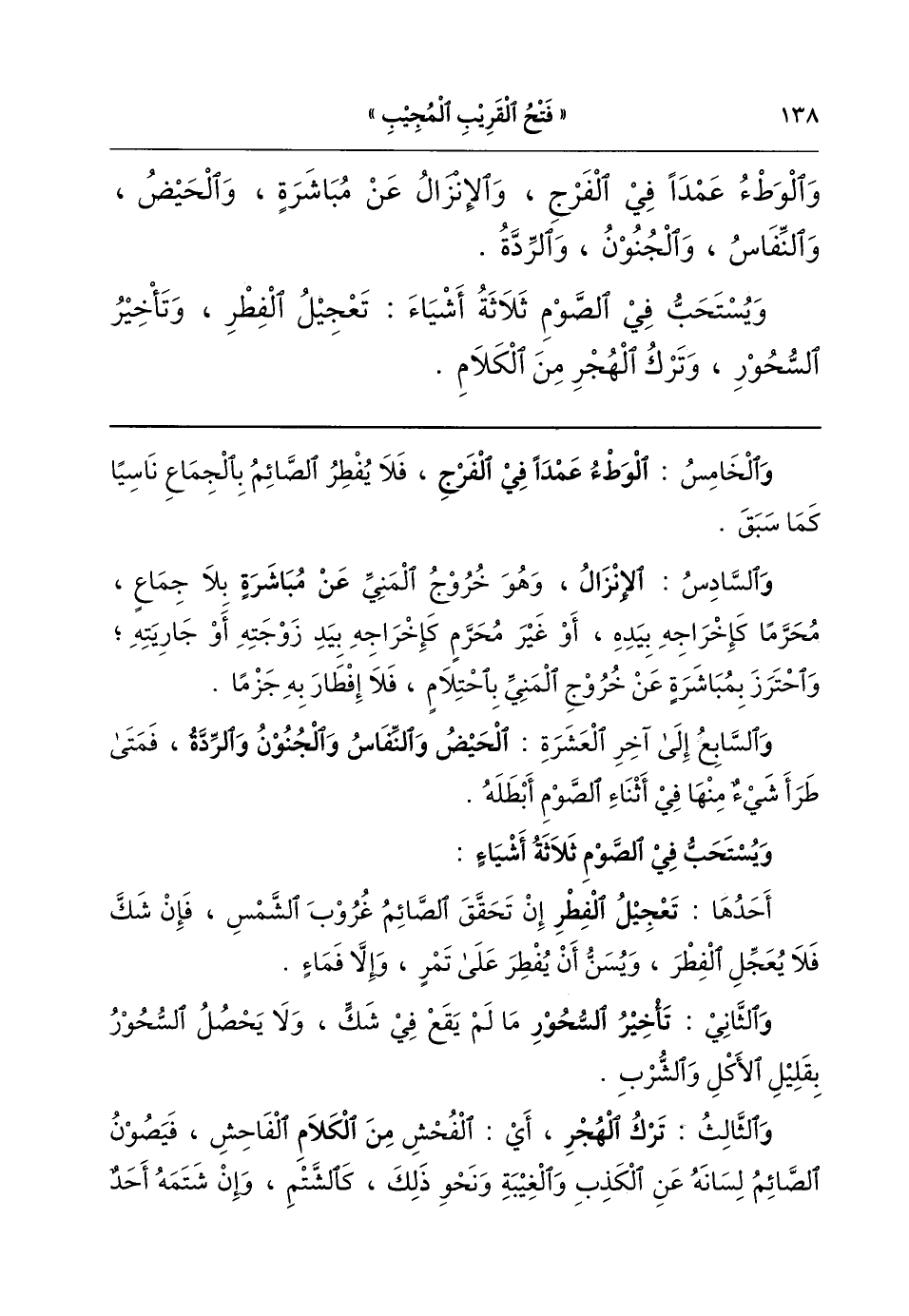 (ويُستحب في الصوم ثلاثة أشياء): أحدها (تعجيل الفطر) إن تحقق الصائمَ غروبُ الشمس؛ فإن شكَّ فلا يعجل الفطرَ. ويسن أن يُفطِر على تمر، وإلا فماء. (و) الثاني (تأخير السحور) مالم يقع في شك، فلا يؤخر. ويحصل السحور بقليل الأكل والشرب. (و) الثالث (ترك الهُجْر) أي الفُحش (من الكلام) الفاحش، فيصون الصائم لسانَه عن الكذب والغِيبة ونحو ذلك، كالشتم. وإن شتمه أحدٌ