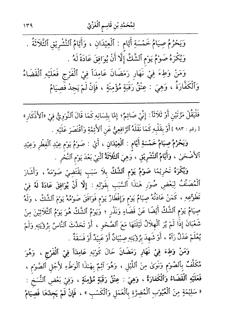 (ويحرم صيام خمسة أيام: العيدان) أي صوم يوم عيد الفطر وعيد الأضحى، (وأيام التشريق) وهي (الثلاثة) التي بعد يوم النحر.
