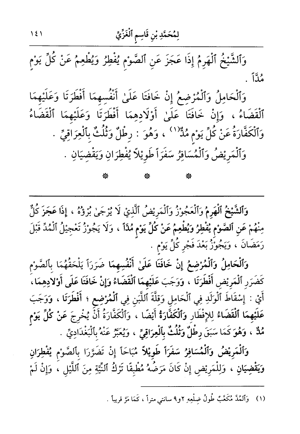 (والحامل والمرضع إن خافتا على أنفسهما) ضررا يلحقهما بالصوم، كضرر المريض (أفطرتا، و) وجب (عليهما القضاء، وإن خافتا على أولادهما) أي إسقاط الولد في الحامل وقلة اللبن في المرضع (أفطرتا، و) وجب (عليهما القضاء) للإفطار (والكفارة) أيضا. والكفارة أن يُخرج (عن كل يوم مد؛ وهو) كما سبق (رطل وثلث بالعراقي). ويعبر عنه بالبغدادي.