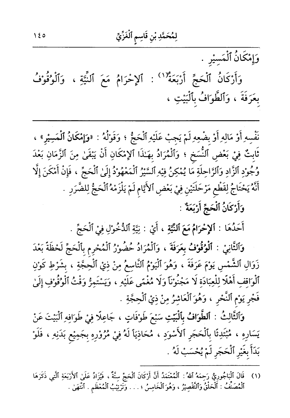 (وأركان الحج أربعة): أحدها (الإحرام مع النية) أي نية الدخول في الحج. (و) الثاني (الوقوف بعرفة). والمراد حُضور المُحرِم بالحَج لحظةً بعدَ زوال الشمس يومَ عرفةَ، وهو اليوم التاسع من ذي الحجة بشرط كون الواقف أهلا للعبادة، لا مجنونا ولا مُغْمَى عليه. ويستمر وقت الوقوف إلى فجر يوم النحر، وهو العاشر من ذي الحجة. (و) الثالث (الطواف بالبيت) سبع طوفات جاعلا في طوافه البيتَ عن يساره مبتدئا بالحجر الأسود محاذيا له في مروره بجميع بدنه؛ فلو بدأ بغير الحجر لم يحسب له.