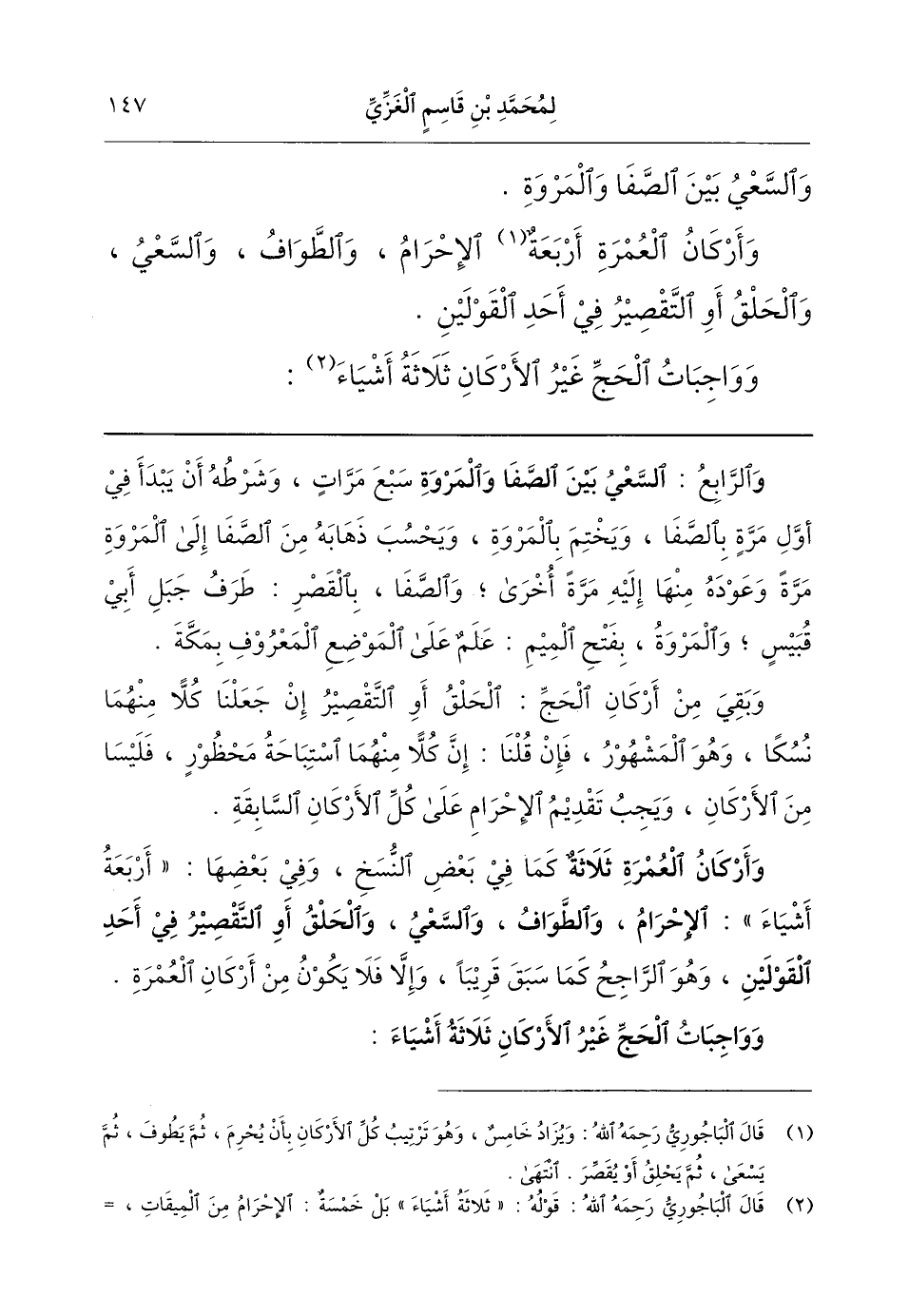 (و) الرابع (السعي بين الصفا والمروة) سبع مرات. وشرطه أن يبدأ في أول مرة بالصفا ويختم بالمروة، ويُحسب ذهابه من الصفا إلى المروة مرةً، وعوده منها إليه مرة أخرى. والصفا بالقصر طرف جبل أبي قبيس، والمَروة بفتح الميم علَم على الموضع المعروف بمكة.