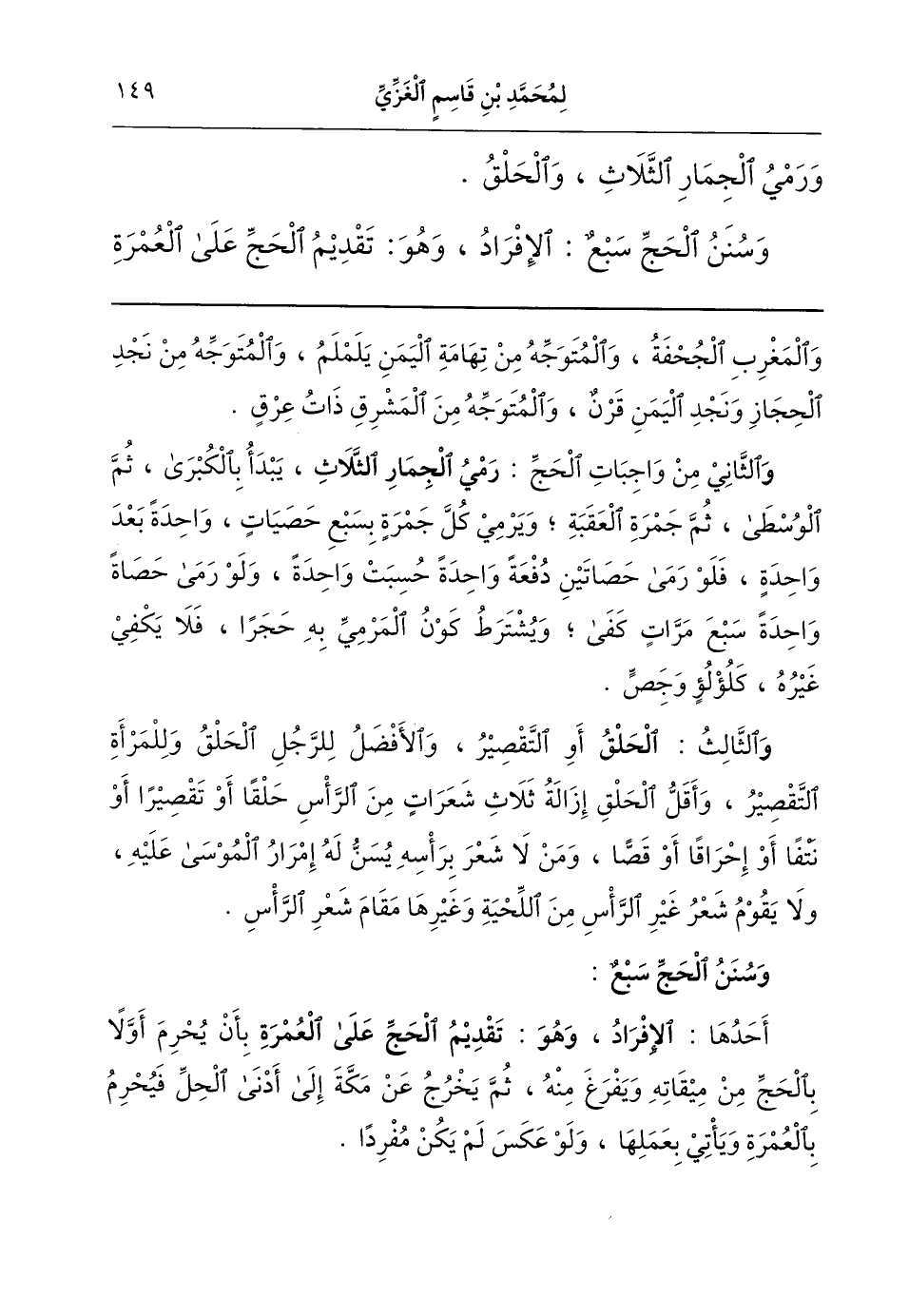 والمغرب الجُحْفَة، والمتوجه من تِهامة اليمن يَلَمْلَم، والمتوجه من نجد الحجاز ونجد اليمن قَرْن، والمتوجه من المشرق ذات عِرْق. (و) الثاني (رمي الجمار الثلاث) يبدأ بالكبرى ثم الوسطى ثم جمرة العقبة. ويرمى كل جمرة بسبع حصيات واحدةً بعد واحدة؛ فلو رمى حصاتين دفعة واحدة حسبت واحدة، ولو رمى حصاة واحدة سبع مرات كفى. ويشترط كون المرمَى به حجرا، فلا يكفي غيره كلؤلؤ وجص، (و) الثالث (الحلق) أو التقصير. والأفضل للرجل الحلق، وللمرأة التقصير. وأقل الحلق إزالة ثلاث شعرات من الرأس حلقا أو تقصيرا أو نتفا أو إحراقا أو قصًّا. ومن لا شعر برأسه يُسنُّ له إمرار المُوسَى عليه. ولا يقوم شعر غير الرأس من اللحية وغيرها مقام شعر الرأس.