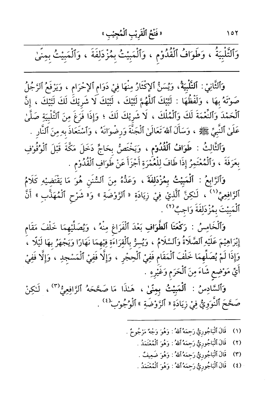 (و) الثاني (التلبية)، ويسن الإكثار منها في دوام الإحرام. ويرفع الرجل صوته بها. ولفظها: «لَبَّيْكَ اللهُمَّ لَبَّيْكَ، لَبَّيْكَ لاَ شَرِيكَ لَكَ لَبَّيْكَ، إنَّ الحَمْدَ وَالنِّعْمَةَ لَكَ وَالْمُلْكَ، لاَ شَرِيْكَ لَكَ». وإذا فرغ من التلبية صلى على النبي - صلى الله عليه وسلم - وسأل اللهَ تعالى الجنة ورضوانه واستعاذ به من النار. (و) الثالث (طواف القدوم). ويختص بحاجٍّ دخل مكة قبل الوقوف بعرفة. والمعتمر إذا طاف العمرة أجزأه عن طواف القدوم. (و) الرابع (المبيت بمزدلفةَ). وعَدّه من السنن هو ما يقتضيه كلام الرافعي، لكن الذي في زيادة الروضة وشرح المهذب أن المبيت بمزدلفة واجب. (و) الخامس (ركعتا الطواف) بعد الفراغ منه، ويصليهما خلف مقام إبراهيم عليه الصلاة والسلام؛ ويُسِرُّ بالقراءة فيهما نهارا، ويجهر بها ليلا. وإذا لم يصلهما خلفَ المقام ففي الحِجر، وإلا ففي المسجد، وإلا ففي أي موضع شاء من الحرم وغيره. (و) السادس (المبيت بمنى). هذا ما صححه الرافعي، لكن صحح النووي في زيادة الروضة الوجوب.