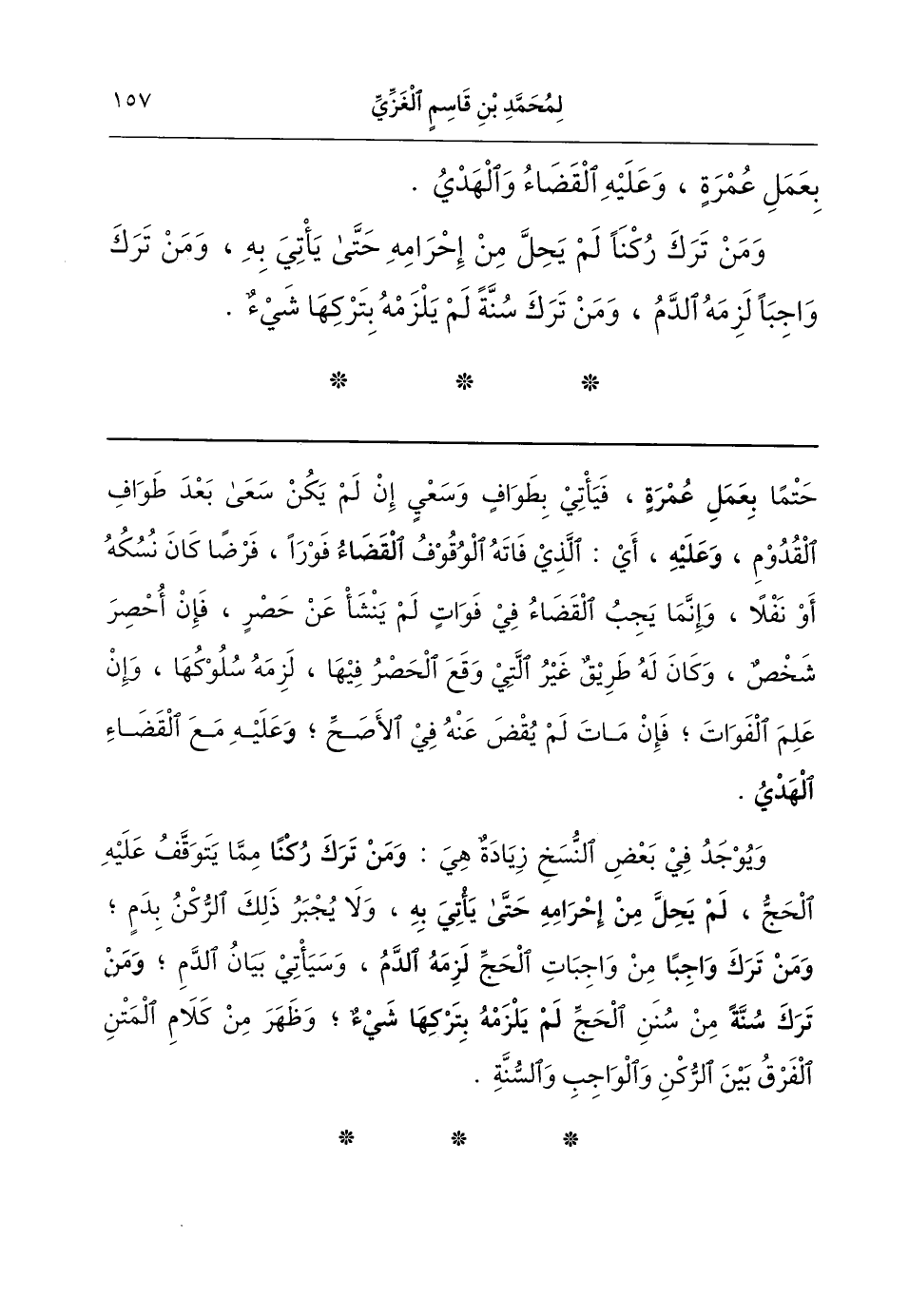 حتمًا (بعمل عمرة)، فيأتي بطواف وسعي إن لم يكن سعي بعد طواف القدوم، (وعليه) أي الذي فاته الوقوف (القضاء) فورا، فرضا كان نسكه أو نفلا. وإنما يجب القضاء في فوات لم ينشأ عن حصر؛ فإن أحصر شخص وكان له طريق غير التي وقع الحصر فيها لزمه سلوكُها وإن علم الفوات. فإن مات لم يقض عنه في الأصح. (و) عليه مع القضاء (الهدي). ويوجد في بعض النسخ زيادة، وهي: (ومن ترك ركنا) مما يتوقف عليه الحج (لم يحل من إحرامه حتى يأتي به) ولا يجبر ذلك الركن بدم؛ (ومن ترك واجبا) من واجبات الحج (لزمه الدم) وسيأتي بيان الدم. (ومن ترك سنة) من سنن الحج (لم يلزمه بتركها شيءٌ). وظهر من كلام المتن الفرق بين الركن والواجب والسنة.