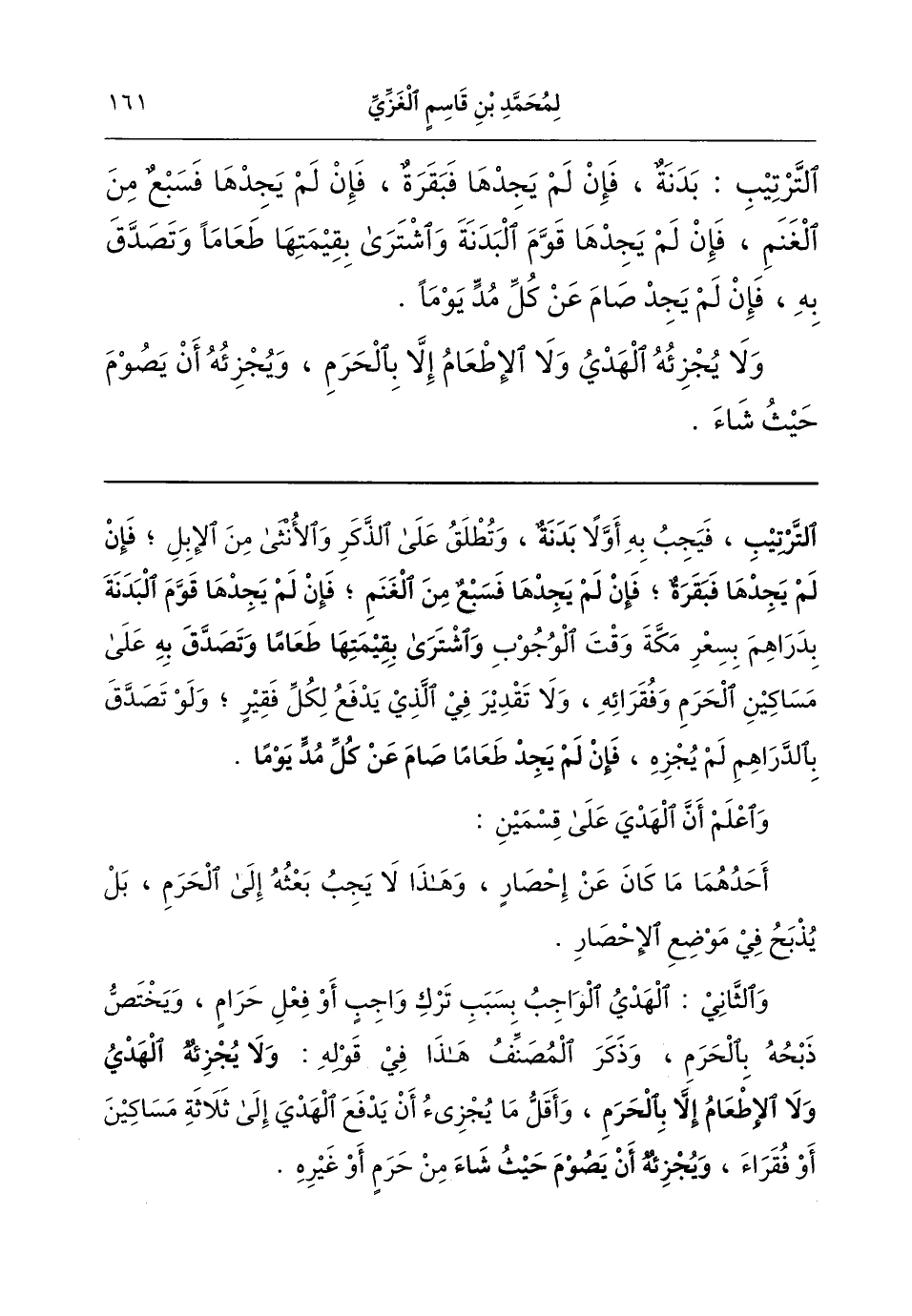 واعلم أن الهَدْي على قسمين: أحدهما ما كان عن إحصار، وهذا لا يجب بعثه إلى الحرم، بل ذبح في موضع الإحصار؛ والثاني الهدي الواجب بسبب ترك واجب أو فعل حرام، ويختص ذبحه بالحرم. وذكر المصنف هذا في قوله: