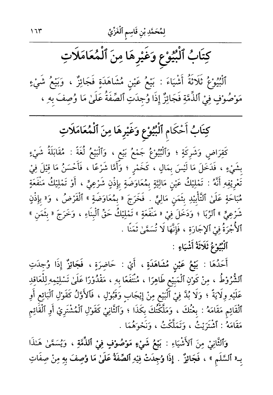 (البيوع ثلاثة أشياء): أحدها (بيع عين مشاهدة) أي حاضرة (فجائز) إذا وجدت الشروط من كون المبيع طاهرا منتفعا به، مقدورا على تسليمه، للعاقد عليه ولاية. ولا بد في البيع من إيجاب وقبول؛ فالأول كقول البائع أو القائم مقامه: «بعتُك وملكتُك بكذا»؛ والثاني كقول المشتري أو القائم مقامه: «اشتريت وتملكتُ» ونحوهما. (و) الثاني من الأشياء (بيع شيء موصوف في الذمَّة) ويسمى هذا بالسلم (فجائز إذا وجدت) فيه (الصفة على ما وُصف به) من صفات