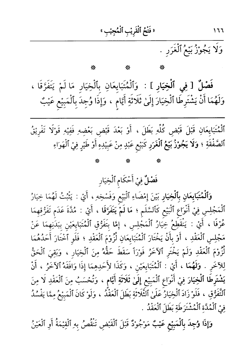 {فصل} في أحكام الخيار. (والمتبايعان بالخيار) بين إمضاء البيع وفسخه، أي يثبت لهما خيار المجلس في أنواع البيع كالسَلَم (مالم يتفرقا) أي مدة عدم تفرقهما عرفا، أي ينقطع خيارُ المجلس إما بتفرُّق المتبايعين ببدنهما عن مجلس العقد أو بأن يختار المتبايعان لزومَ العقد. فلو اختار أحدهما لزومَ العقد ولم يختر الآخر فورا سقط حقه من الخيار، وبقي الحق للآخر.