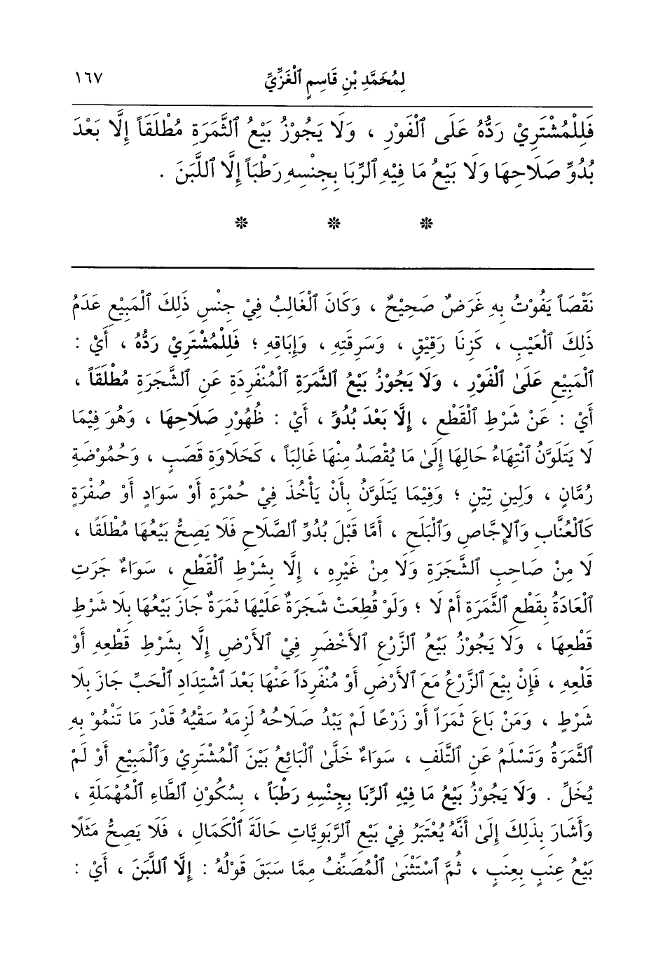 بيعها بلا شرطِ قطعها. ولا يجوز بيع الزرع الأخضر في الأرض إلا بشرطِ قطعِه أو قلعِه، فإن بيع الزرع مع الأرض أو منفردا عنها بعد اشتداد الحَبِّ جاز بلا شرط. ومن باع ثمرا أو زرعا لم يبدُ صلاحُه لزمه سقيُه قدر ما تنمو به الثمرةُ وتسلم عن التلف، سواء خَلَّى البائعُ بين المشتري والمبيع أو لم يُخَلِّ. (ولا) يجوز (بيع ما فيه الربا بجنسه رَطْبا) بسكون الطاء المهملة. وأشار بذلك إلى أنه يعتبر في بيع الربويات حالة الكمال؛ فلا يصح مثلا بيع عِنَب بعنب. ثم استثنى المصنفُ مما سبق قولَه: (إلا اللبنَ)، أي