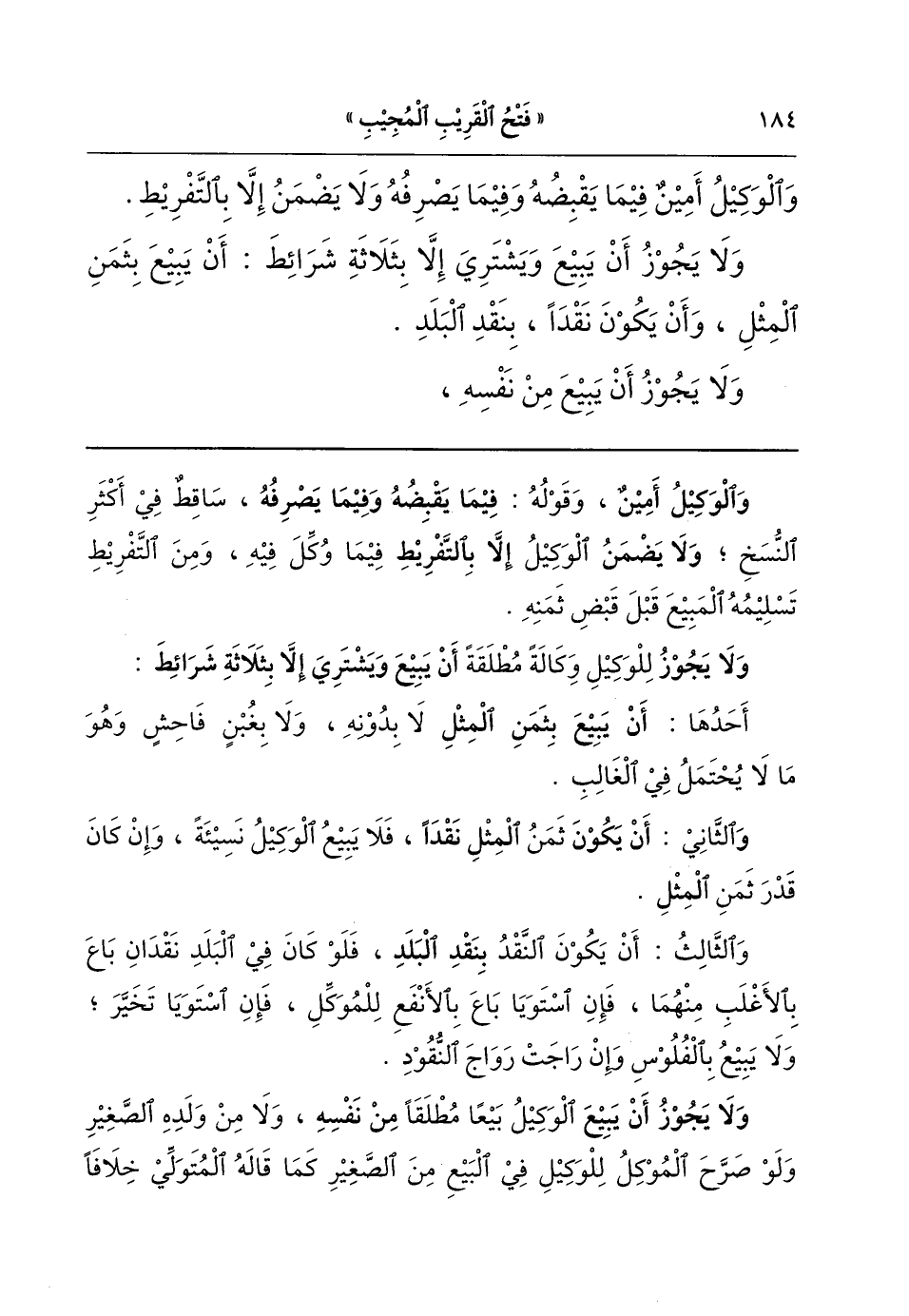 (ولا يجوز) للوكيل وكالةً مطلقة (أن يبيع ويشتري إلا بثلاثة شرائط): أحدها (أن يبيع بثمن المثل)، لا بدونه ولا بغبن فاحش، وهو ما لا يحتمل في الغالب. (و) الثاني (أن يكون) ثمن المثل (نقدا)؛ فلا يبيع الوكيل نسيئةً وإن كان قدر ثمن المثل. والثالث أن يكون النقد (بنقد البلد). فلو كان في البلد نقدان باع بالأغلب منهما؛ فإن استويا باع بالأنفع للموكل؛ فإن استويا تُخُيِّر، ولا يبيع بالفلوس وإن راجت رواجَ النقود. (ولا يجوز أن يبيع) الوكيل بيعا مطلقا (من نفسه) ولا من ولده الصغير ولو صرح الموكل للوكيل في البيع من الصغير - كما قاله المتولي خلافا