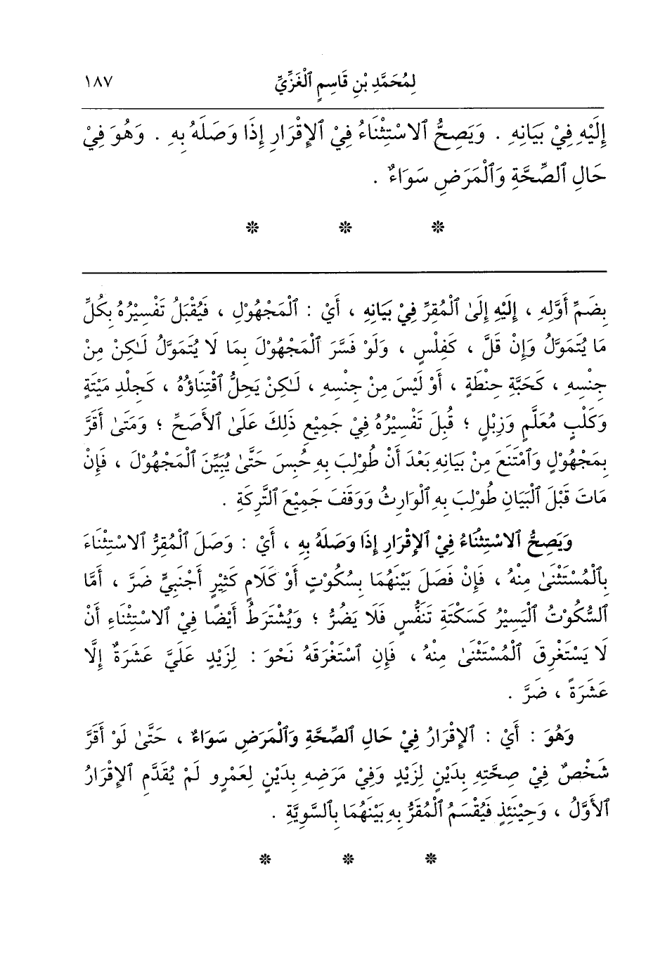 (ويصح الاستثناء في الإقرار إذا وصله به) أي وصل المقر الاستثناء بالمستثنى منه؛ فإن فصل بينهما بسكوت أو كلام كثير أجنبي ضرَّ. أما السكوت اليسير كسكتة تنفس فلا يضر. ويشترط أيضا في الاستثناء أن لا يستغرق المستثنى منه؛ فإن استغرقه نحو: «لزيد عليَّ عشرة إلا عشرة» ضرَّ.