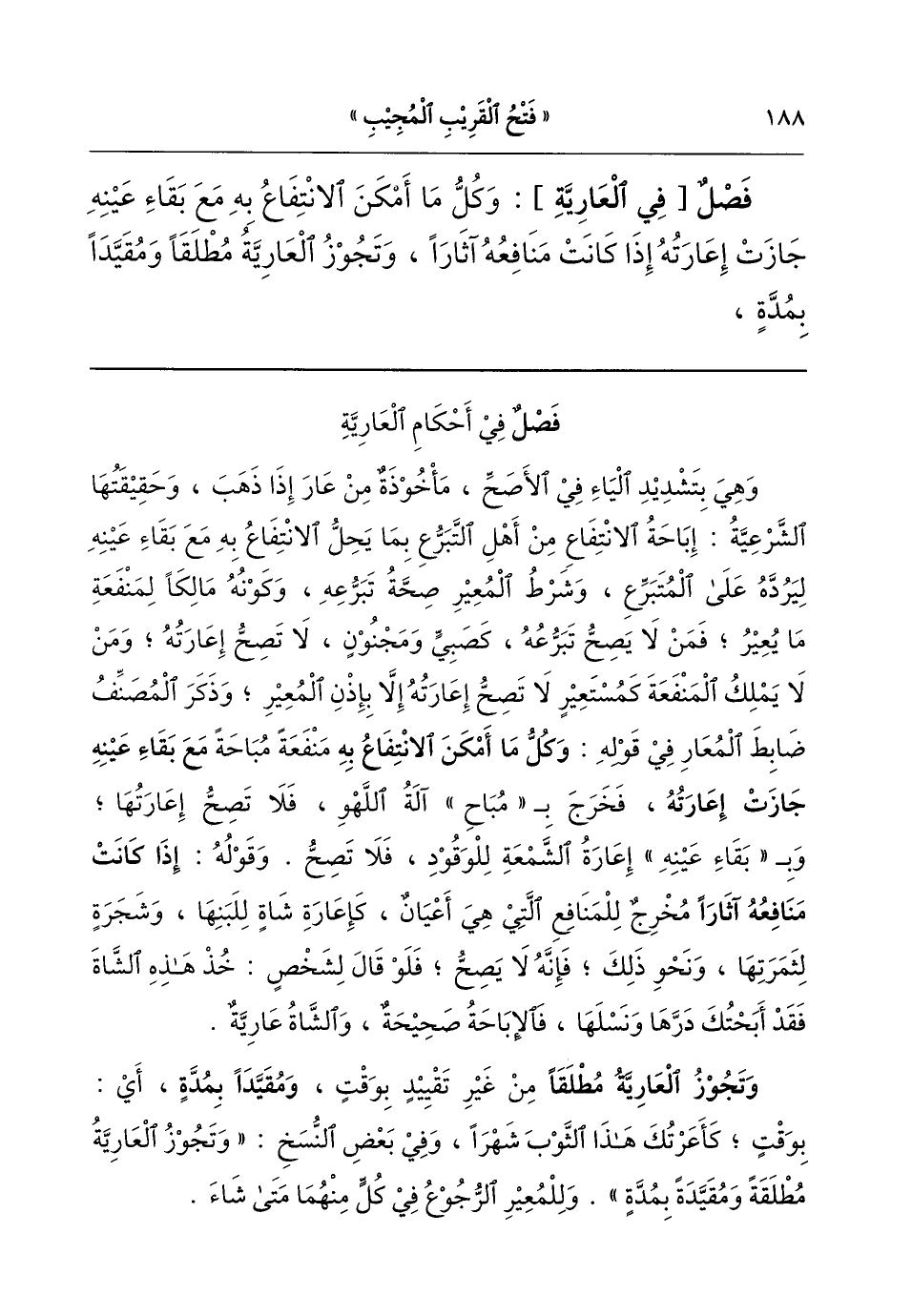 {فصل} في أحكام العارية. وهي بتشديد الياء في الأفصح مأخوذة من عار إذا ذهب. وحقيقتها الشرعية إباحة الانتفاع من أهل التبرع بما يحل الانتفاع به مع بقاء عينه ليرده على المتبرع. وشرط المعير صحة تبرعه وكونه مالكا لمنفعة ما يعيره. فمن لا يصح تبرعه كصبي ومجنون لا تصح إعارته. ومن لا يملك المنفعة كمستعير لا تصح إعارته إلا بإذن المعير. وذكر المصنف ضابط المُعار في قوله: (وكل ما يمكن الانتفاع به) منفعةً مباحةً (مع بقاء عينه جازت إعارته)؛ فخرج بمباحة آلةُ اللهو، فلا تصح إعارتها؛ وببقاء عينه إعارةُ الشمعة للوقود، فلا تصح.