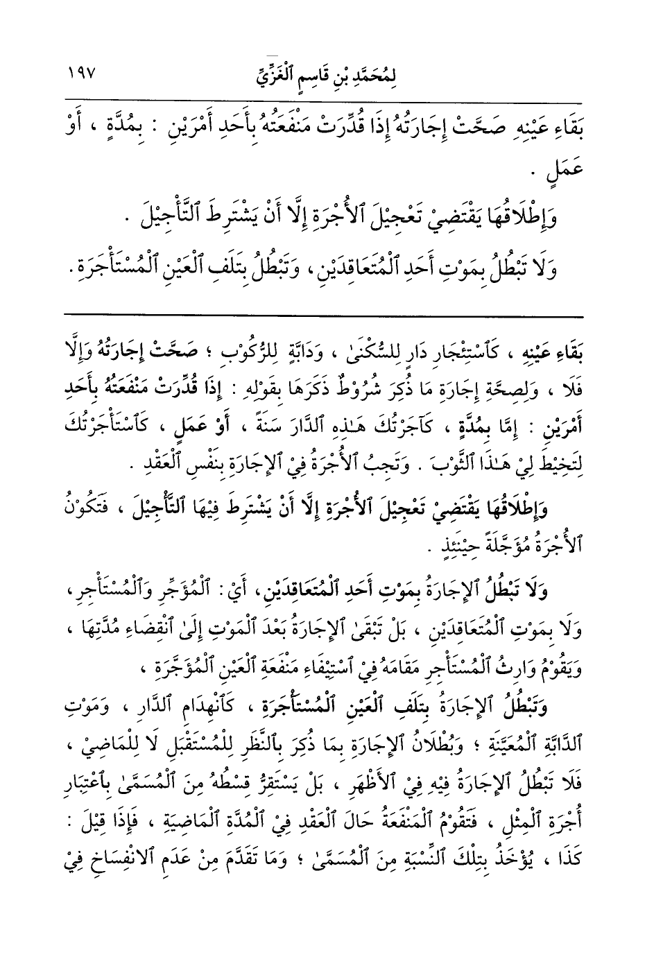 (ولا تبطل الإجارة بموت أحد المتعاقدين) أي المؤجر والمستأجر، ولا بموت المتعاقدين، بل تبقى الإجارة بعد الموت إلى انقضاء مدتها، ويقوم وارث المستأجر مقامه في استيفاء منفعة العين المؤجَرة. (وتبطل) الإجارة (بتلف العين المستأجرة)، كانهدام الدار وموت الدابة المعينة. وبطلانُ الإجارة بما ذكر بالنظر للمستقبل، لا الماضي؛ فلا تبطل الإجارة فيه في الأظهر، بل يستقر قسطه من المسمى باعتبار أجرة المثل، فتُقَوَّم المنفعةُ حال العقد في المدة الماضية. فإذا قيل كذا يؤخذ بتلك النسبة من المسمى. وما تقدم من عدم الانفساخ في