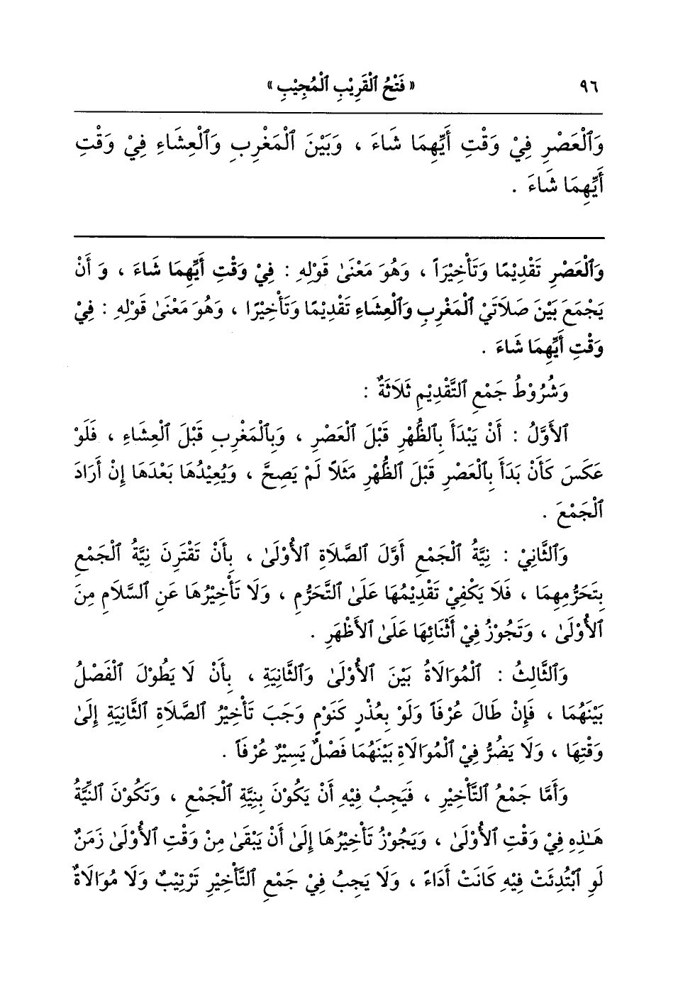 والثالث الموالاة بين الأولى والثانية، بأن لا يطول الفصل بينهما؛ فإن طال عُرفًا ولو بعذر كنوم وجب تأخير الصلاة الثانية إلى وقتها. ولا يضر في الموالاة بينهما فصل يسير عرفا. وأما جمع التأخير فيجب فيه أن يكون نية الجمع، وتكون النية هذه في وقت الأولى. ويجوز تأخيرها إلى أن يبقى من وقت الأولى زمنٌ لو ابتُدِئت فيه كانت أداء. ولا يجب في جمع التأخير ترتيبٌ ولا موالاة