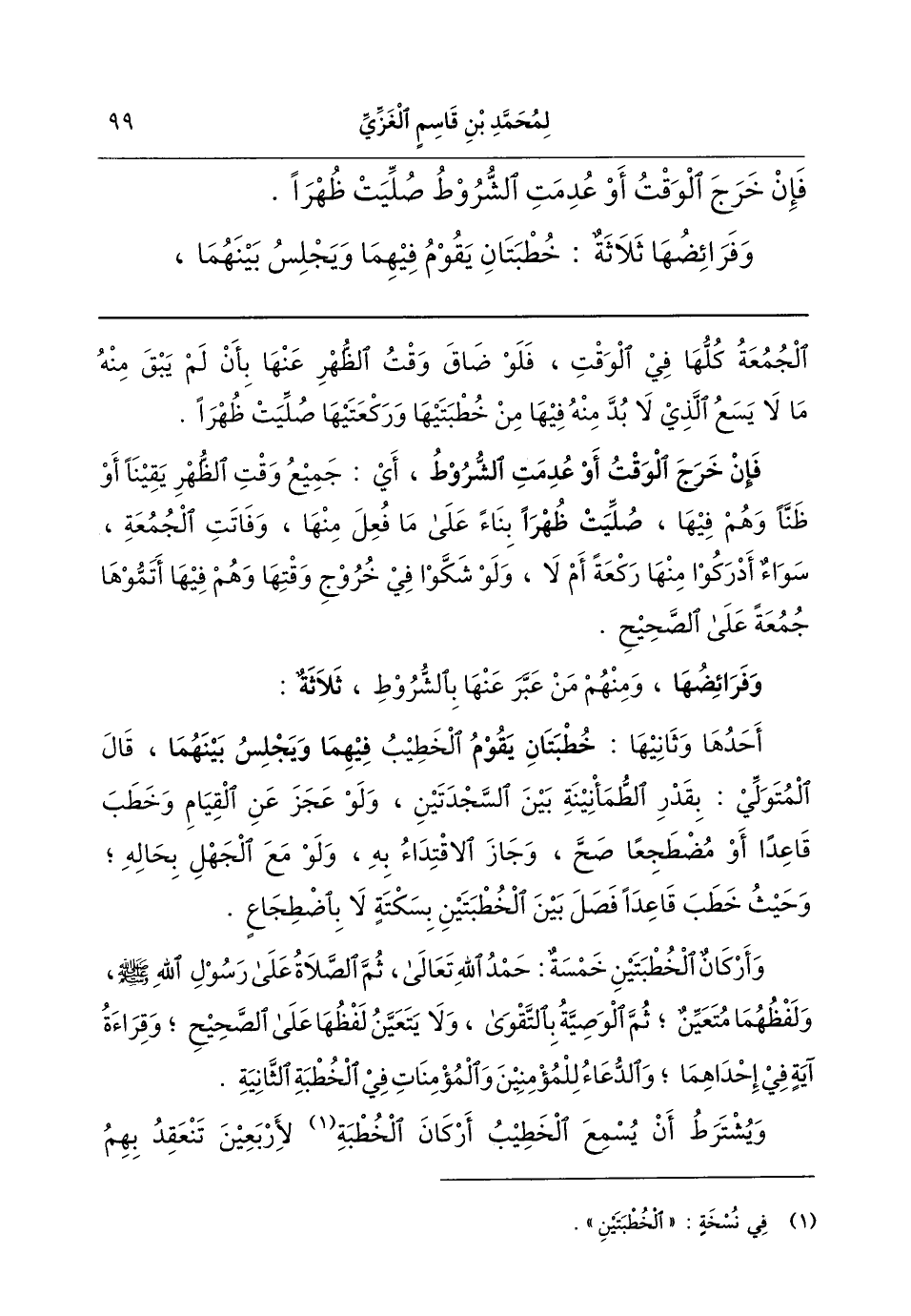 وأركان الخطبة خمسة: حمد الله تعالى، ثم الصلاة على رسول الله - صلى الله عليه وسلم -. ولفظهما متعين، ثم الوصية بالتقوى، ولا يتعين لفظها على الصحيح، وقراءة آية في إحداهما، والدعاء للمؤمنين والمؤمنات في الخطبة الثانية. ويشترط أن يُسمِع الخطيبُ أركانَ الخطبة لأربعين تنعقد بهم