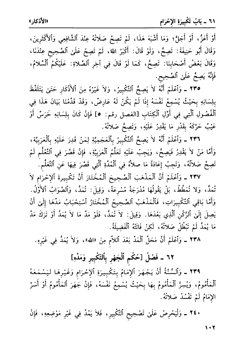 235- واعلم أنه لا يصحّ التكبير، ولا غيره من الأذكار حتى يتلفظ بلسانه بحيثُ يُسمعُ نفسَه إذا لم يكن له عارضٌ، وقد قدّمنا بيان هذا في الفصول التي في أوّل الكتاب [الفصل رقم: 5] فإن كان بلسانه خرسٌ أو عيبُ حركهُ بقدرِ ما يقدرُ عليه، وتصحُّ صلاتهُ.