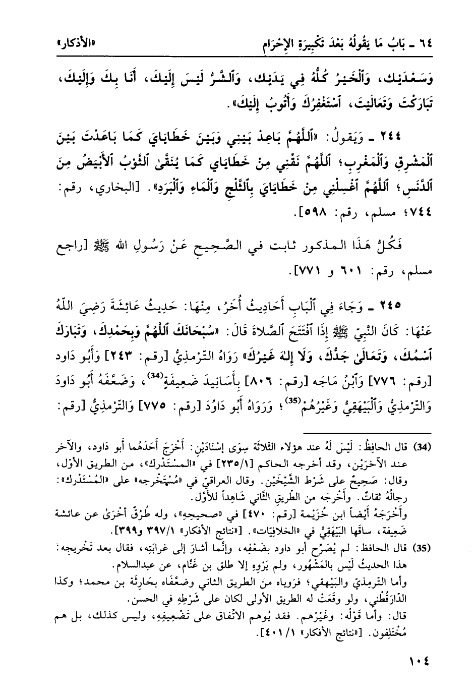 245- وجاء في الباب أحاديث أُخرُ، منها: حديث عائشة رضي الله عنها: كان النبي -صلى الله عليه وسلم- إذا افتتح الصلاة قال: "سُبْحانَكَ اللَّهُمَّ وبِحَمْدِكَ، وَتَبَارَكَ اسْمُكَ، وَتَعالى جَدُّكَ، وَلاَ إلهَ غَيْرُكَ" رواه الترمذي [رقم: 243] وأبو داود [رقم: 776] وابن ماجه [رقم: 806] بأسانيد ضعيفة1، وضعفهُ أبو داود والترمذي والبيهقي وغيرهم2؛ ورواهُ أبو داود [رقم: 775] والترمذي [رقم: