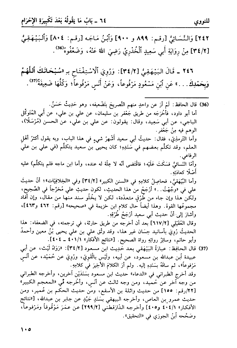 246- قال البيهقي [34/2] : وروي الاستفتاح بـ"سُبْحانَكَ اللَّهُمَّ وبِحَمْدِكَ ... " عن ابن مسعود مرفوعاً، وعن أنسٍ مرفوعاً؛ وكلها ضعيفة2.