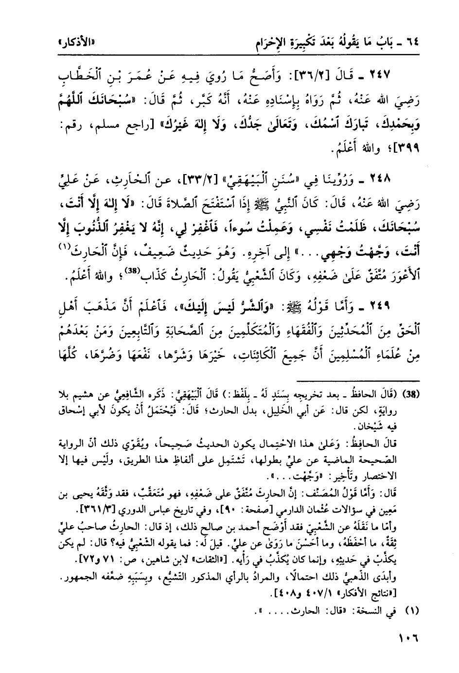 248- وروينا في "سنن البيهقي" [33/2] ، عن الحارث، عن علي رضي الله عنهُ، قال: كان النبي -صلى الله عليه وسلم- إذا استفتح الصلاة قالَ: "لا إِلهَ إِلاَّ أَنْتَ، سُبْحانَكَ، ظَلَمْتُ نَفْسِي، وَعَمِلْتُ سُوءاً، فاغْفِرْ لي، إنَّهُ لا يَغْفِرُ الذُّنُوبَ إِلاَّ أَنْتَ، وَجَّهْتُ وَجْهيَ ... " إلى آخِرِه. وهو حديث ضعيف، فإن الحارث1 الأعور متفق على ضعفه، وكان الشعبيّ يقول: الحارث كذّاب2؛ والله أعلم.