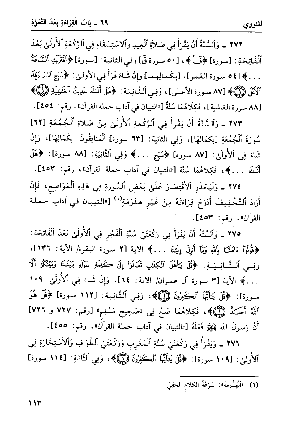 273- والسنّة أن يقرأ في الركعة الأولى من صلاة الجمعة [62] سورة الجمعة [بكمالها] ، وفي الثانية: [63 سورة] المنافقون [بكمالها] ، وإن شاء في الأولى: [سورة] {سَبِّحِ} وفي الثانية: [سورة] : {هَلْ أَتَاكَ} ، فكلاهما سنة ["التبيان في آداب حملة القرآن"، رقم: 453] .