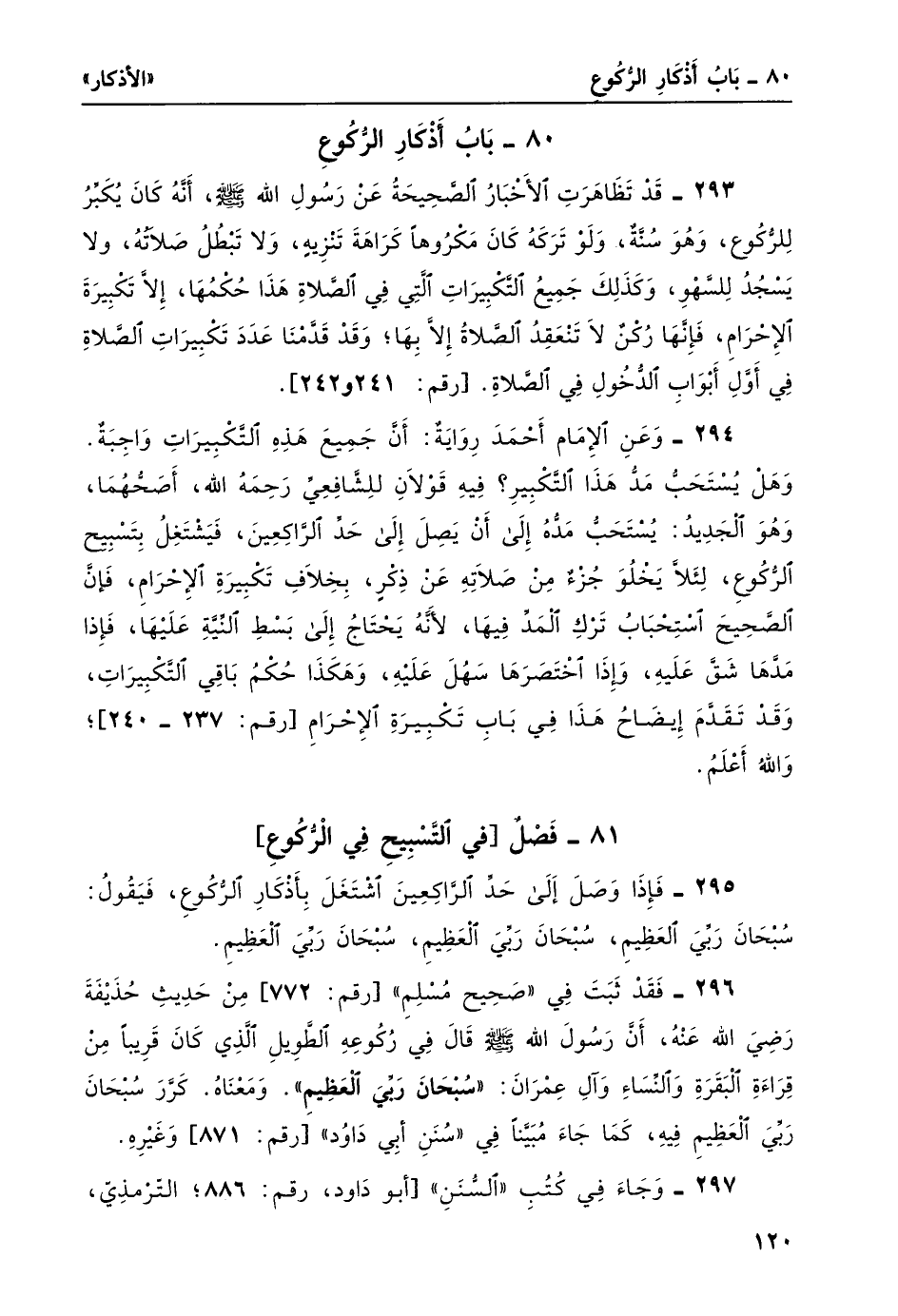 293- قد تظاهرت الأخبارُ الصحيحةُ عن رسول الله -صلى الله عليه وسلم- أنه كان يُكَبِّر للركوع، وهو سنّة، ولو تكره كان مكروهاً كراهة تنزيه، ولا تبطلُ صلاتُه، ولا يسجدُ للسهو، وكذلك جميع التكبيرات التي في الصلاة هذا حكمُها، إلا تكبيرة الإِحرام، فإنها ركن لا تنعقد الصلاة إلا بها، وقد قدّمنا عدد تكبيرات الصلاة في أوّل أبواب الدخول في الصلاة. [رقم: 241 و242] .