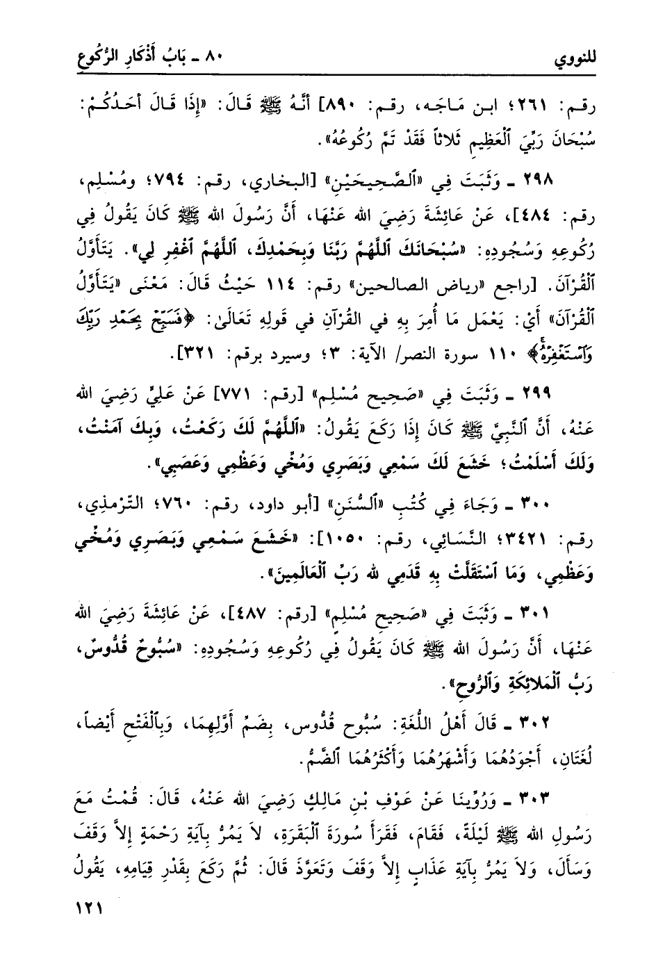 301- وثبت في "صحيح مسلم" [رقم: 487] ، عن عائشة رضي الله عنها, أن رسول الله -صلى الله عليه وسلم- كان يقولُ في ركوعه وسجوده: "سُبُّوحٌ قُدُّوسٌ، رَبُّ المَلائِكَةِ والرُّوحِ".
