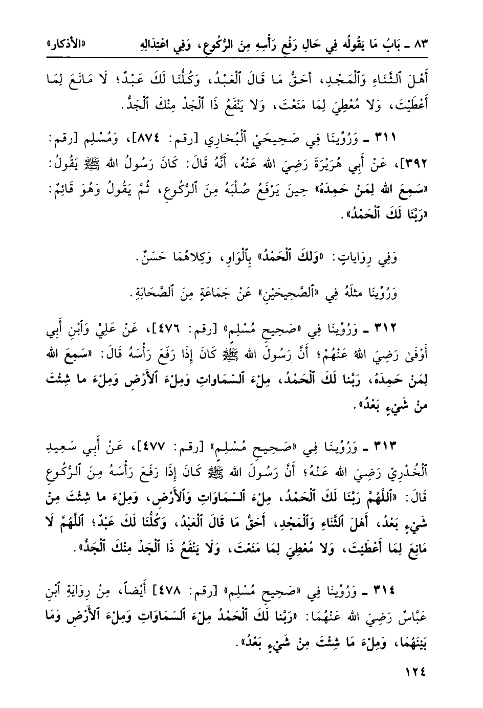 313- وروينا في "صحيح مسلم" [رقم: 477] ، عن أبي سعيد الخدري رضي الله عنه؛ أن رسول الله صلى الله عليه وسلم كان إذا رفع رأسه من الركوع قال: "اللَّهُمَّ رَبَّنَا لَكَ الحَمْدُ، مِلْءَ السَّمَوَاتِ وَالأرْضِ، وَمِلْءَ ما شئت من شيء بَعْدُ، أهْلَ الثَّناءِ والمجد، أحق ما قال العبد، وكلنا لَكَ عَبْدٌ؛ اللَّهُمَّ لا مانِعَ لِمَا أعطيت، ولا معطي لِمَا مَنَعْتَ، وَلا يَنْفَعُ ذَا الجَدِّ مِنْكَ الجَدُّ".