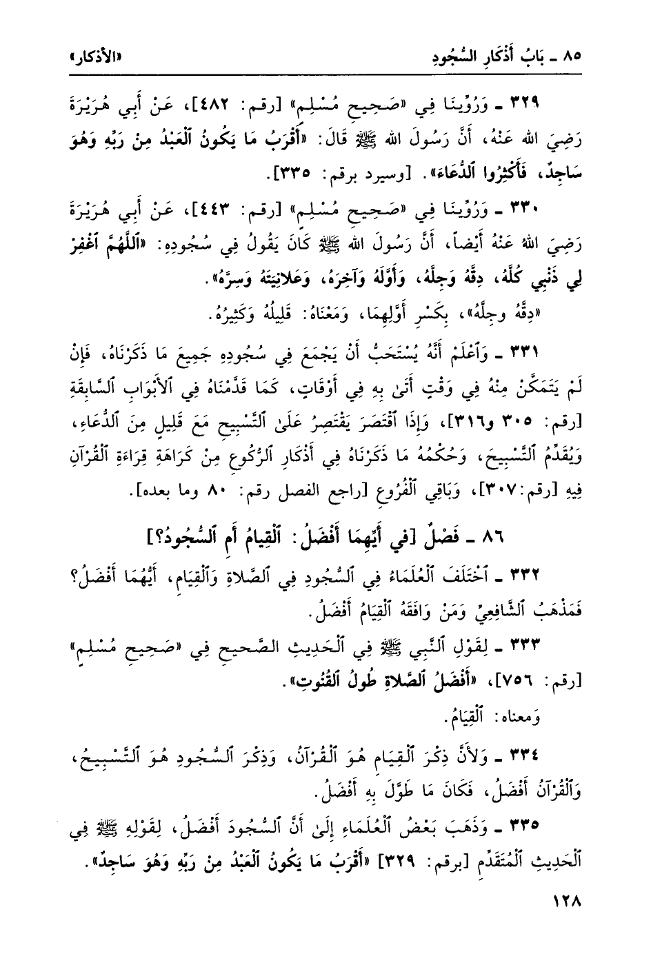 332- اختلف العلماء في السجود في الصلاة والقيام، أيُّهما أفضل؟ فمذهب الشافعي ومن وافقه القيام أفضل.