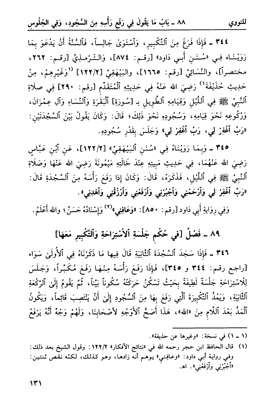 345- وربما رويناهُ في "سنن البيهقي" [122/2] ، عن ابن عباس رضي الله عنهما، في حديث مبيته عند خالته ميمونة رضي الله عنها وصلاة النبيّ صلى الله عليه وسلم في الليل، فذكره، قال: وكان إذا رفع رأسه من السجدة قال: "رَبّ اغْفِرْ لي وارْحَمْنِي واجْبُرْنِي وَارْفَعْنِي وَارْزُقْنِي وَاهْدِني".