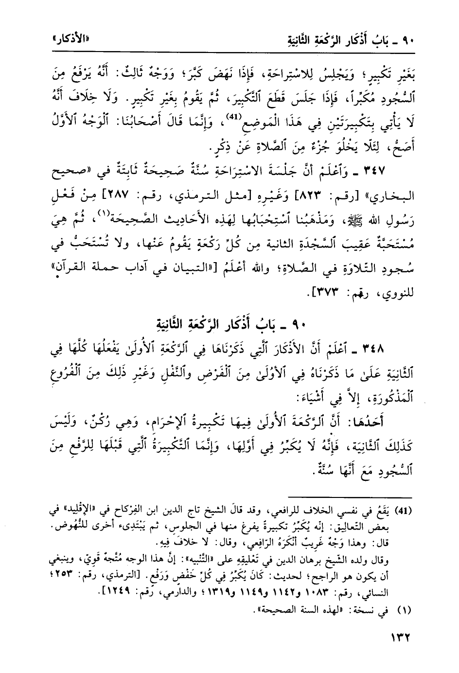 348- اعلم أن الأذكار التي ذكرناها في الركعة الأولى يفعلها كلَّهَا في الثانية على ما ذكرناه في الأولى من الفرض والنفل وغير ذلك من الفروع المذكورة، إلا في أشياء: