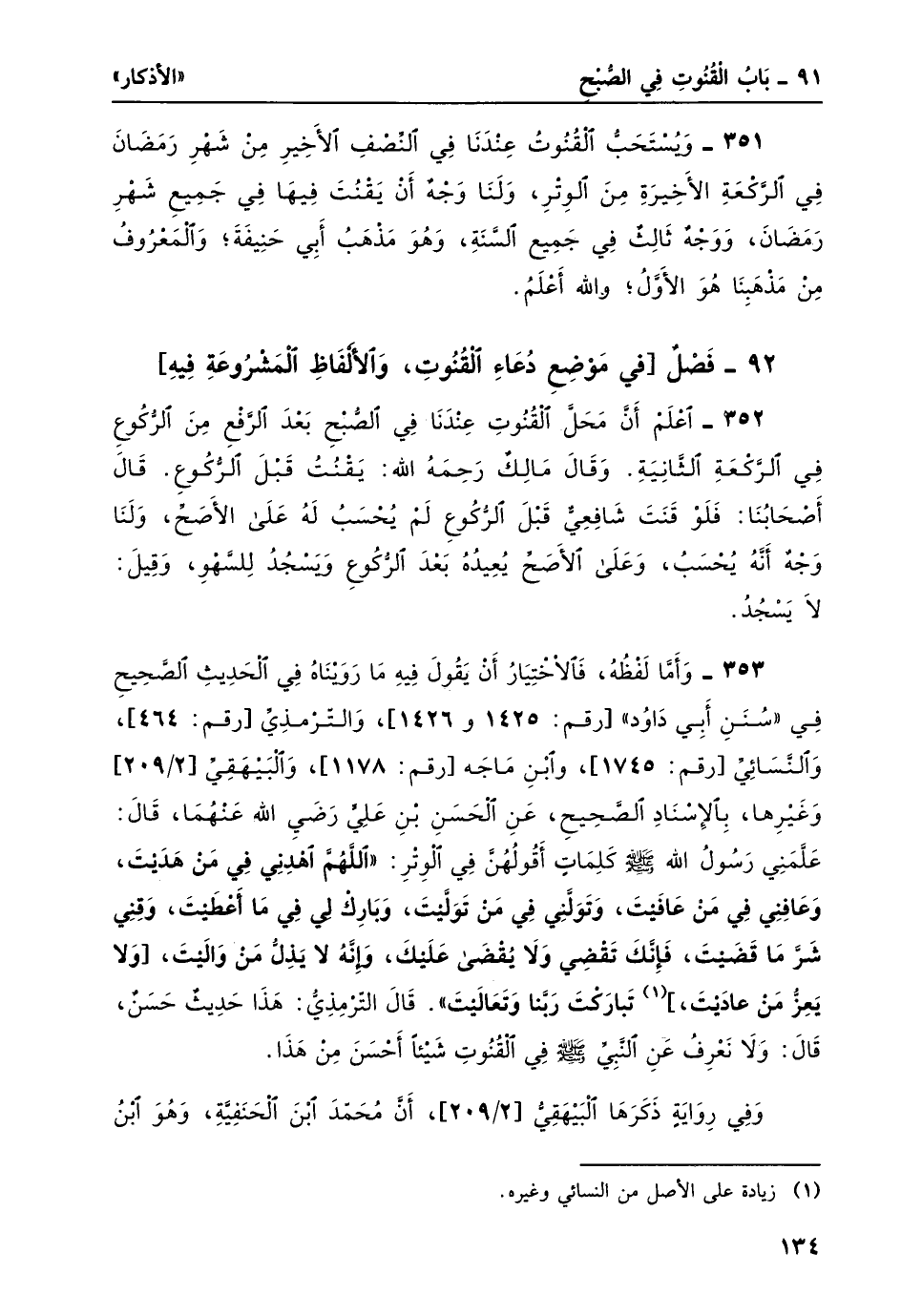 353- وأما لفظه، فالاختيار أن يقول فيه ما رويناه في الحديث الصحيح في "سنن أبي داود" [رقم: 1425 و1426] ، والترمذي [رقم: 464] ، والنسائي [رقم: 1745] ، وابن ماجه [رقم: 1178] ، والبيهقي [209/2] وغيرها، بالإِسناد الصحيح، عن الحسن بن عليّ رضي الله عنهما، قال: علمني رسول الله صلى الله عليه وسلم كلماتٍ أقولُهُنَّ في الوتر: "اللَّهُمَّ اهدني في من هديت وعافني في من عافيت، وتولني في من تَوَلَّيْتَ، وبَارِكْ لِي في ما أَعْطَيْتَ، وَقِني شَرَّ ما قَضَيْتَ، فإنَّكَ تَقْضِي وَلا يُقْضَى عَلَيْكَ، وَإِنَّهُ لا يَذِلُّ مَنْ وَالَيْتَ، [ولا يعز من عاديت] 1، تَبَارَكْتَ رَبَّنا وَتَعالَيْتَ". قال الترمذي: هذا حديث حسن، قال: ولا نعرف عن النبي -صلى الله عليه وسلم- في القنوت شيئاً أحسن من هذا.