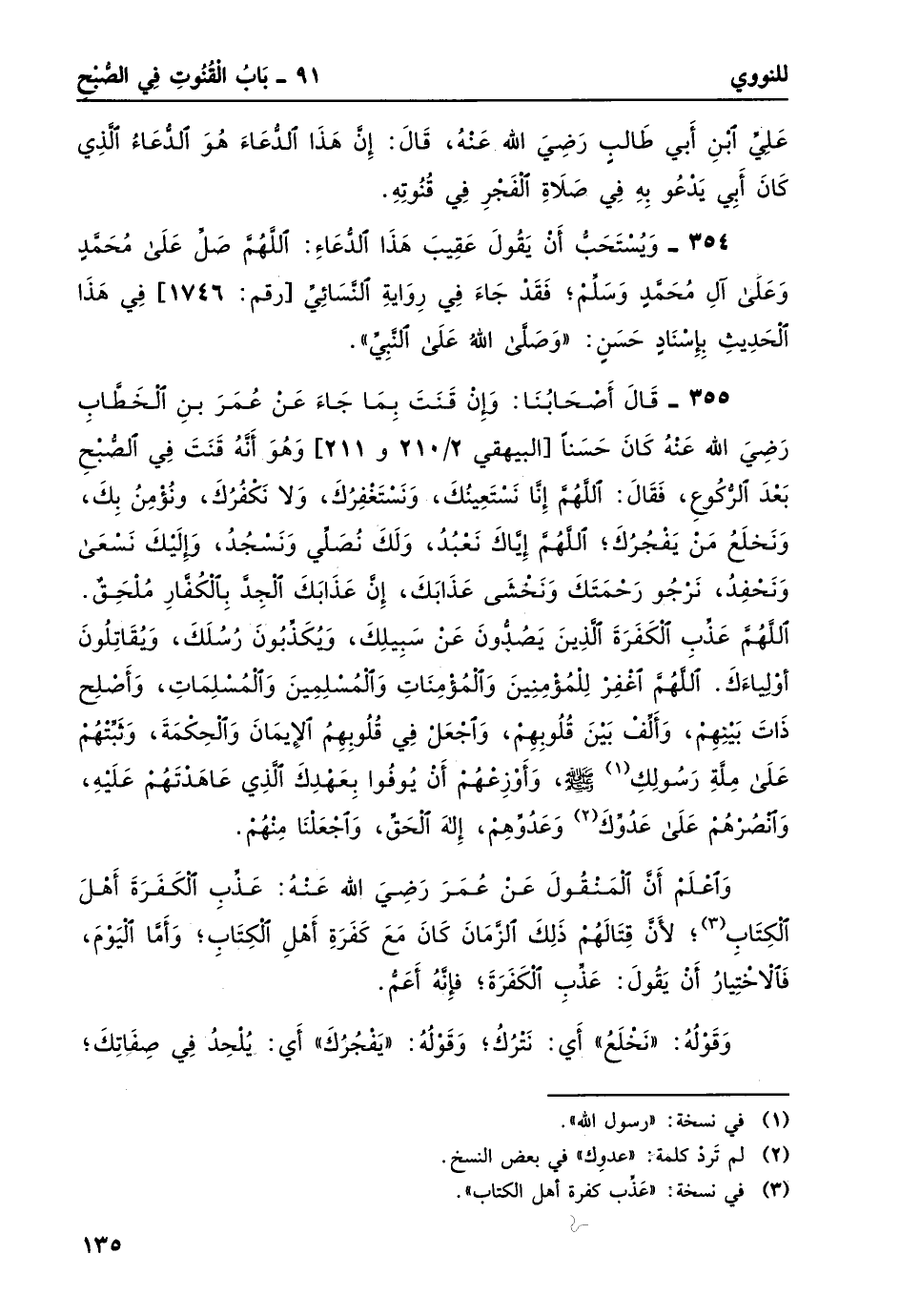 355- قال أصحابنا: وإن قنت بما جاءَ عن عُمر بن الخطاب رضي الله عنه كان حسنًا [البيهقي 210/2 و211] وهو أنه قنت في الصبح بعد الركوع، فقال: اللَّهُمَّ إنَّا نَسْتَعِينُكَ، وَنَسْتَغْفِرُكَ، وَلاَ نَكْفُرُكَ، وَنُؤْمِنُ بِكَ، وَنَخْلَعُ مَنْ يَفْجُرُكَ؛ اللَّهُمَّ إيَّاكَ نعبدُ، ولَكَ نُصلي وَنَسْجُد، وَإِلَيْكَ نَسْعَى وَنحْفِدُ، نَرْجُو رَحْمَتَكَ وَنَخْشَى عَذَابَكَ، إنَّ عَذَابَكَ الْجِدَّ بالكُفَّارِ مُلْحِقٌ. اللَّهُمَّ عَذّبِ الكَفَرَةَ الَّذِينَ يَصُدُّونَ عَنْ سَبِيلِكَ، ويُكَذِّبُونَ رُسُلَكَ، وَيُقاتِلُونَ أوْلِيَاءَكَ. اللَّهُمَّ اغْفِرْ للْمُؤْمِنِينَ والمؤمنات والمسلمين والمُسْلِماتِ، وأصْلِح ذَاتَ بَيْنِهِمْ، وأَلِّفْ بَيْنَ قُلُوبِهِمْ، وَاجْعَلْ فِي قُلُوبِهِم الإِيمَانَ وَالحِكْمَةَ، وَثَبِّتْهُمْ على مِلَّةِ رسولِك1 صلى الله عليه وسلم، وَأَوْزِعْهُمْ أنْ يُوفُوا بِعَهْدِكَ الَّذي عاهَدْتَهُمْ عَلَيْهِ، وَانْصُرْهُمْ على عَدُّوَكَ2 وَعَدُوِّهِمْ، إِلهَ الحَقّ، وَاجْعَلْنا منهم.