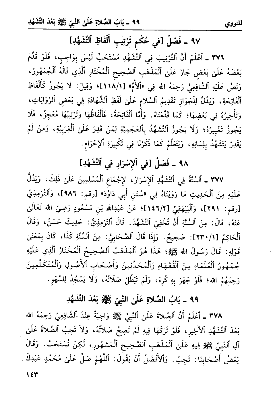 376- اعلم أن الترتيب في التشهد مستحبٌّ ليس بواجب، فلو قدم بعضه على بعض جاز على المذهب الصحيح المختار الذي قاله الجمهور، ونصَّ عليه الشافعي رحمه الله في "الأم" [118/1] ؛ وقيل: لا يجوز كألفاظ الفاتحة، ويدلّ للجواز تقديم السلام على لفظ الشهادة في بعض الروايات، وتأخيره في بعضها؛ كما قدّمناه. وأما الفاتحة، فألفاظها وترتيبها معجزٌ، فلا يجوز تغييره؛ ولا يجوز التشهّد بالعجمية لمن قدر على العربية، ومن لم يقدر يتشهد بلسانه، ويتعلم كما ذكرنا في تكبيرة الإحرام.