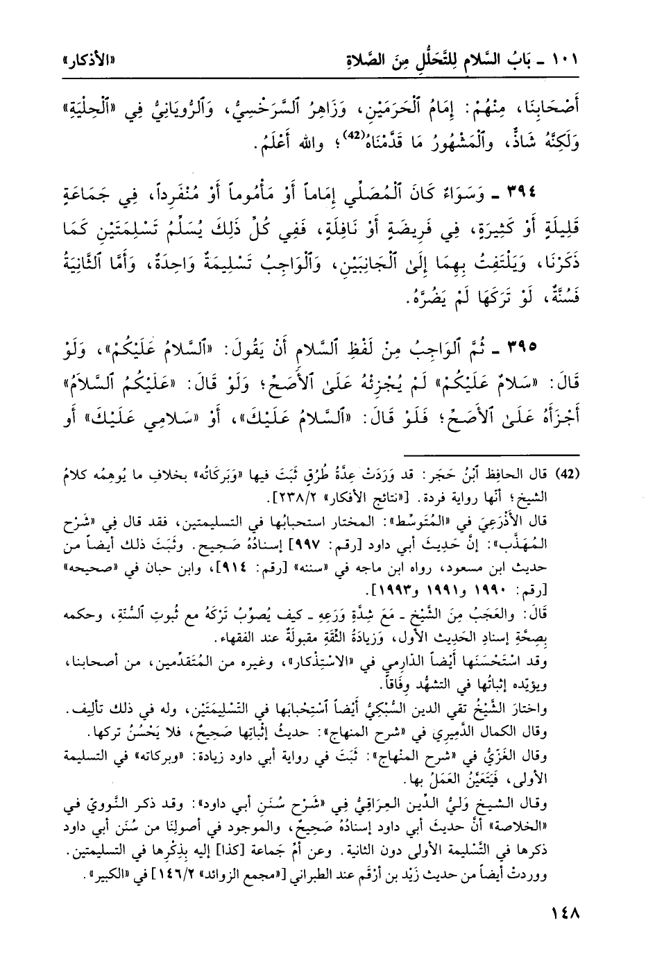 394- وسواءٌ كان المُصلي إماماً أو مأموماً أو منفرداً، في جماعة قليلة أو كثيرة، في فريضة أو نافلة، ففي كل ذلك يُسلِّم تسليمتين كما ذكرنا، ويلتفتُ بهما إلى الجانبين، والواجب تسليمة واحدةٌ، وأما الثانية فسنّة، لو تركها لم يضرّه.