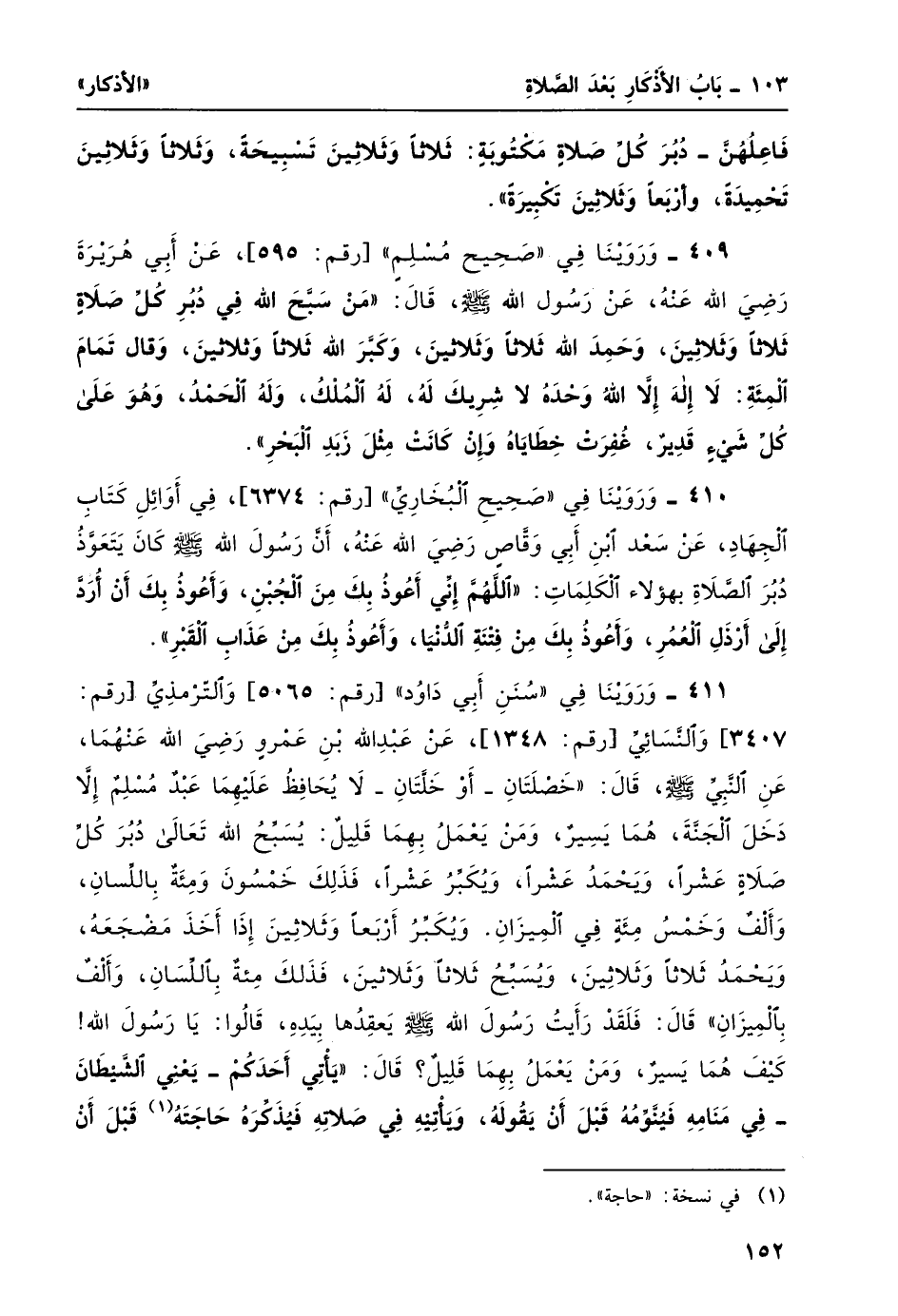 411- وروينا في "سنن أبي داود" [رقم: 5065] والترمذي [رقم: 3407] والنسائي [رقم: 1348] ، عن عبد الله بن عمرو رضي الله عنهما، عن النبي -صلى الله عليه وسلم- قال: "خصلتان -أوْ خَلَّتانِ- لا يُحافِظُ عَلَيْهِمَا عَبْدٌ مُسْلِمٌ إلاَّ دَخَلَ الجَنَّةَ، هُمَا يَسِيرٌ، وَمَنْ يَعْمَلُ بِهِمَا قَلِيلٌ: يُسَبِّحُ اللَّهُ تَعالى دُبُرَ كُلّ صلاةٍ عَشْراً، ويحمدُ عَشْراً، ويكبرُ عَشْراً، فذلك خمسون ومائة باللسان، وألف وخمس مائة في الميزان. وَيُكَبِّرُ أرْبَعاً وَثَلاثِينَ إذَا أخَذَ مَضْجَعَةُ، وَيحْمَدُ ثَلاثاً وَثَلاثينَ، وَيُسَبِّحُ ثَلاثاً وَثَلاثينَ، فذلك مائة باللِّسانِ، وألفٌ بالميزَانِ"، قال: فلقد رأيتُ رسولَ الله -صلى الله عليه وسلم- يعقدها بيده، قالوا: يا رسول الله! كيف هما يسير، ومن يعمل بهما قليل؟ قال: "يأتِي أحدكم -يعيني الشيطان- في مَنامِهِ فَيُنَوِّمُهُ قَبْلَ أنْ يقول، ويأتِيهِ في صَلاتِهِ فيذكره حاجته 1 قبل أن