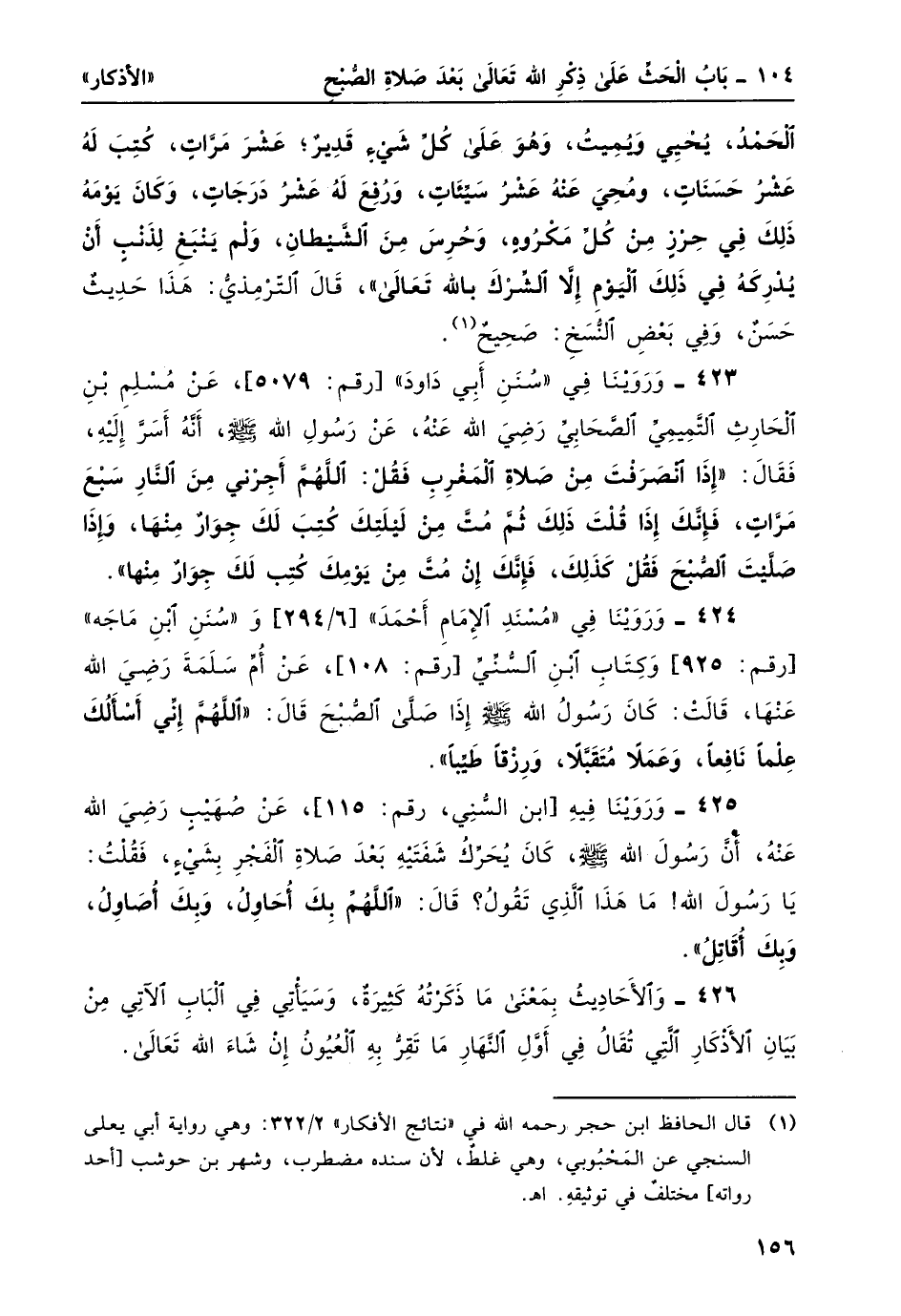 426- والأحاديثُ بمعنى ما ذكرته كثيرةٌ، وسيأتي في الباب الآتي من بيان الأذكار التي تقال في أوّل النهار ما تقرّ به العيون إن شاء الله تعالى.