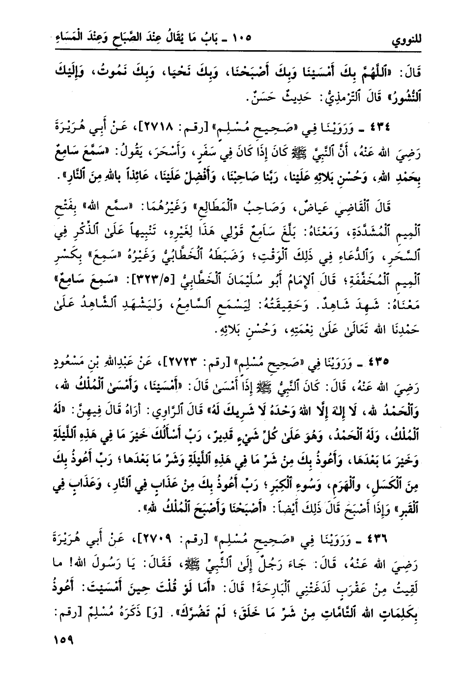 435- وروينا في "صحيح مسلم" [رقم: 2723] ، عن عبد الله بن مسعود رضي الله عنه، قال: كان النبي -صلى الله عليه وسلم- إذا أمسى قال: "أمْسَيْنا، وأمْسَى المُلْكُ لِلَّهِ، والحَمْدُ لِلَّهِ، لا إله إلا الله وحدهُ لا شَرِيكَ لَهُ" قال الراوي: أراهُ قال فيهنٌ: "لهُ المُلْكُ، وَلَهُ الحَمْدُ، وَهُوَ على كُلّ شَيْءٍ قديرٌ، رَبّ أسألُكَ خَيْرَ ما فِي هَذِهِ اللَّيْلَةِ وَخَيْرَ مَا بَعْدَها، وأعُوذ بِكَ مِنْ شَرّ ما في هَذِهِ اللَّيْلَةِ وَشَرّ مَا بَعْدَهَا، رَبّ أَعُوذُ بِكَ مِنَ الكَسَل، وَالهَرَمِ، وَسُوءِ الكِبَرِ، رَبّ أَعُوذُ بِكَ مِنْ عَذَابٍ في النَّارِ، وَعَذَابٍ في القَبْرِ". وَإذَا أصْبَحَ قالَ ذلكَ أيْضاً: "أصْبَحْنا وأصْبَحَ المُلْكُ لِلَّهِ".