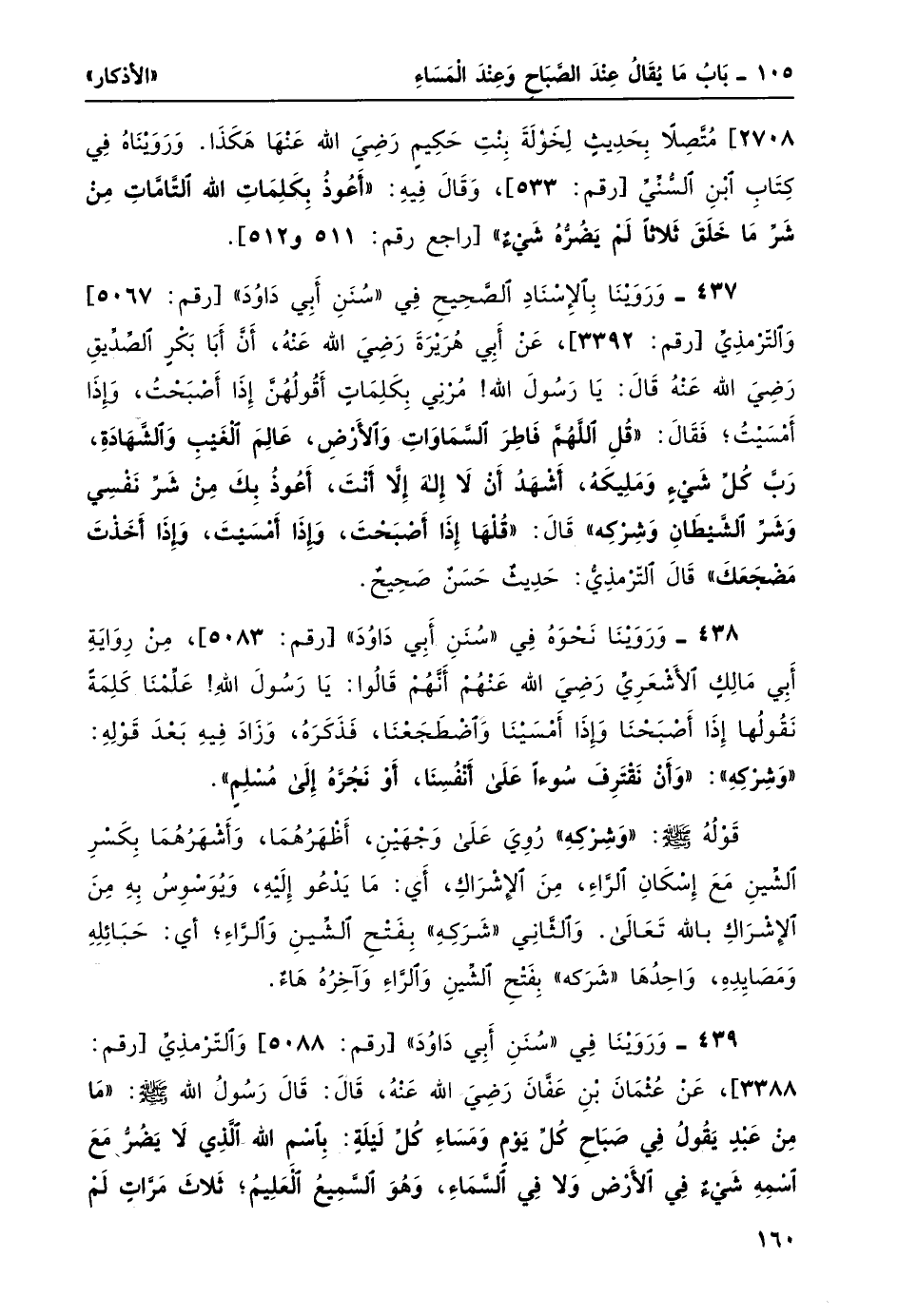437- وروينا بالإِسناد الصحيح في "سنن أبي داود" [رقم: 5067] والترمذي [رقم: 3392] ، عن أبي هريرة رضي الله عنه، أن أبا بكر الصديق رضي الله عنه قال: يا رسول الله! مُرْني بكلمات أقولهنّ إذا أصبحتُ، وإذا أمسيت؛ فقال: "قُل اللَّهُمَّ فَاطِرَ السَّمَوَاتِ وَالأرْضِ، عالِمَ الغَيْبِ وَالشَّهَادَةِ، رَبَّ كُلِّ شَيْءٍ وَمَلِيكَهُ، أشهدُ أنْ لا إِلهَ إِلاَّ أنْتَ، أعوذ بك من شر نفسي وشر الشَّيْطانِ وَشِرْكِهِ" قالَ: "قُلْها إذَا أصْبَحْتَ، وَإذَا أمْسَيْتَ، وَإذَا أخَذْتَ مَضْجَعَكَ" قال الترمذي: حديث حسن صحيح.