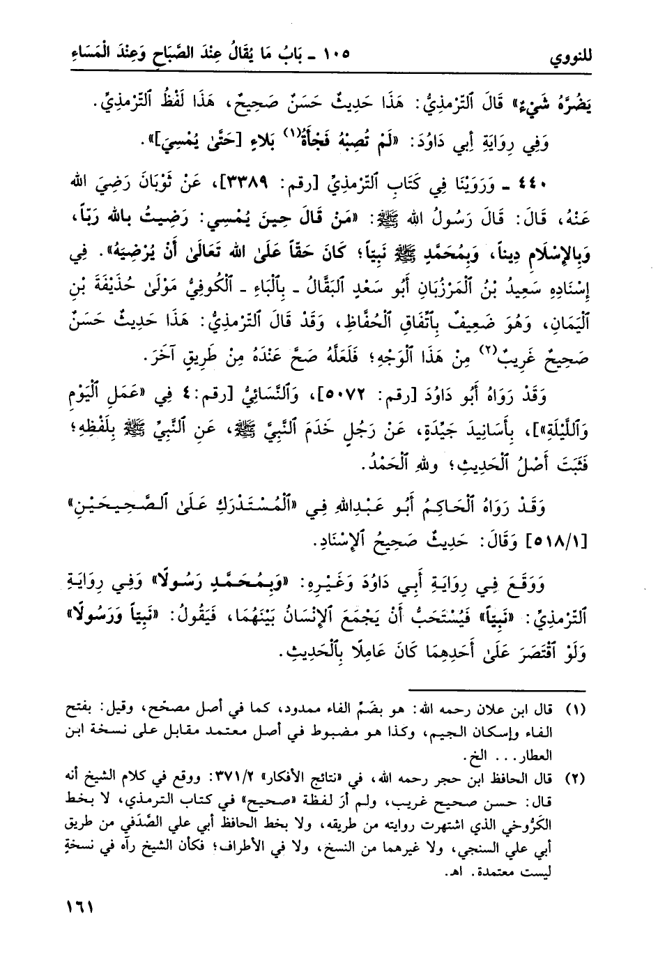 440- وروينا في كتاب الترمذي [رقم: 3389] ، عن ثوبان رضي الله عنهُ، قال: قال رسولُ الله -صلى الله عليه وسلم: "مَنْ قالَ حِينَ يُمْسِي: رَضِيتُ بالله ربا، وبالإسلام دينا، وبمحمد -صلى اللَّهُ عَلَيْهِ وَسَلَّم- نَبِيَّاً؛ كانَ حَقّاً على الله تعالى أنْ يُرضيه". في إسناده سعيد بن المزبان أبو سعد البقال -بالباء- الكوفيّ مولى حذيفة بن اليمان، وهو ضعيف باتفاق الحفاظ، وقد قال الترمذي: هذا حديث حسن صحيح غريب2 من هذا الوجه؛ فلعله صحّ عنده من طريق آخر.