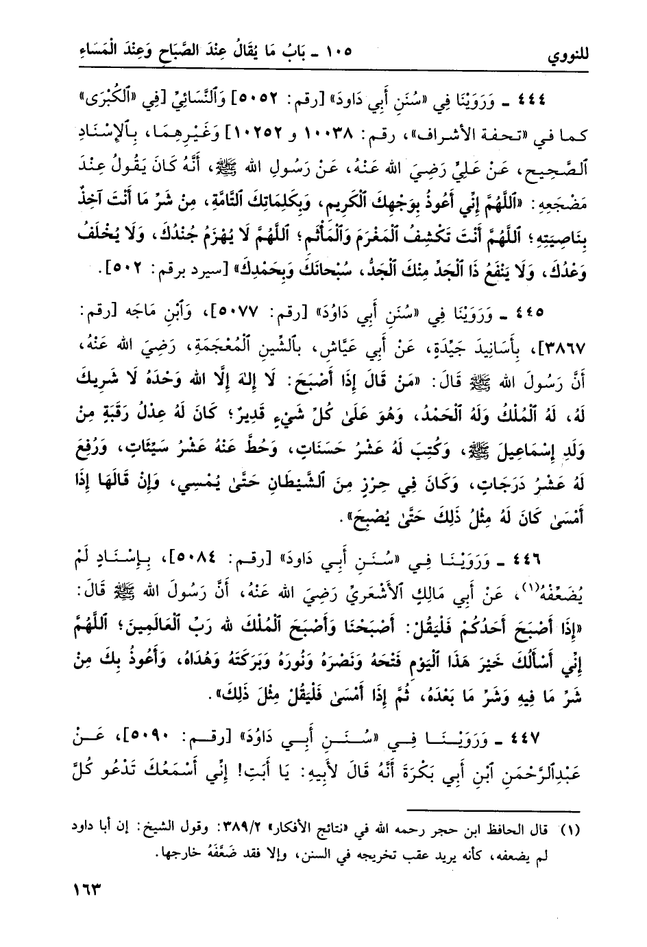 446- وروينا في "سنن أبي داود" [رقم: 5084] ، بإسناد لم يضعفه1، عن أبي مالك الأشعري رضي الله عنه، أن رسول الله -صلى الله عليه وسلم- قال: "إذَا أصْبَحَ أحَدُكُمْ فَلْيَقُلْ: أَصْبَحْنَا وأصْبَحَ المُلْكُ لِلَّهِ رَبّ العالمين؛ اللهم إني أسألُكَ خَيْرَ هَذَا اليَوْمِ فَتْحَهُ ونصرهُ وَنُورَهُ وَبَرَكَتَهُ وَهُدَاهُ، وأعُوذُ بِكَ مِنْ شَر ما فِيهِ وَشَرِّ ما بَعْدَهُ، ثُمَّ إذا أمْسَى فَلْيَقُلْ مِثْلَ ذلكَ".