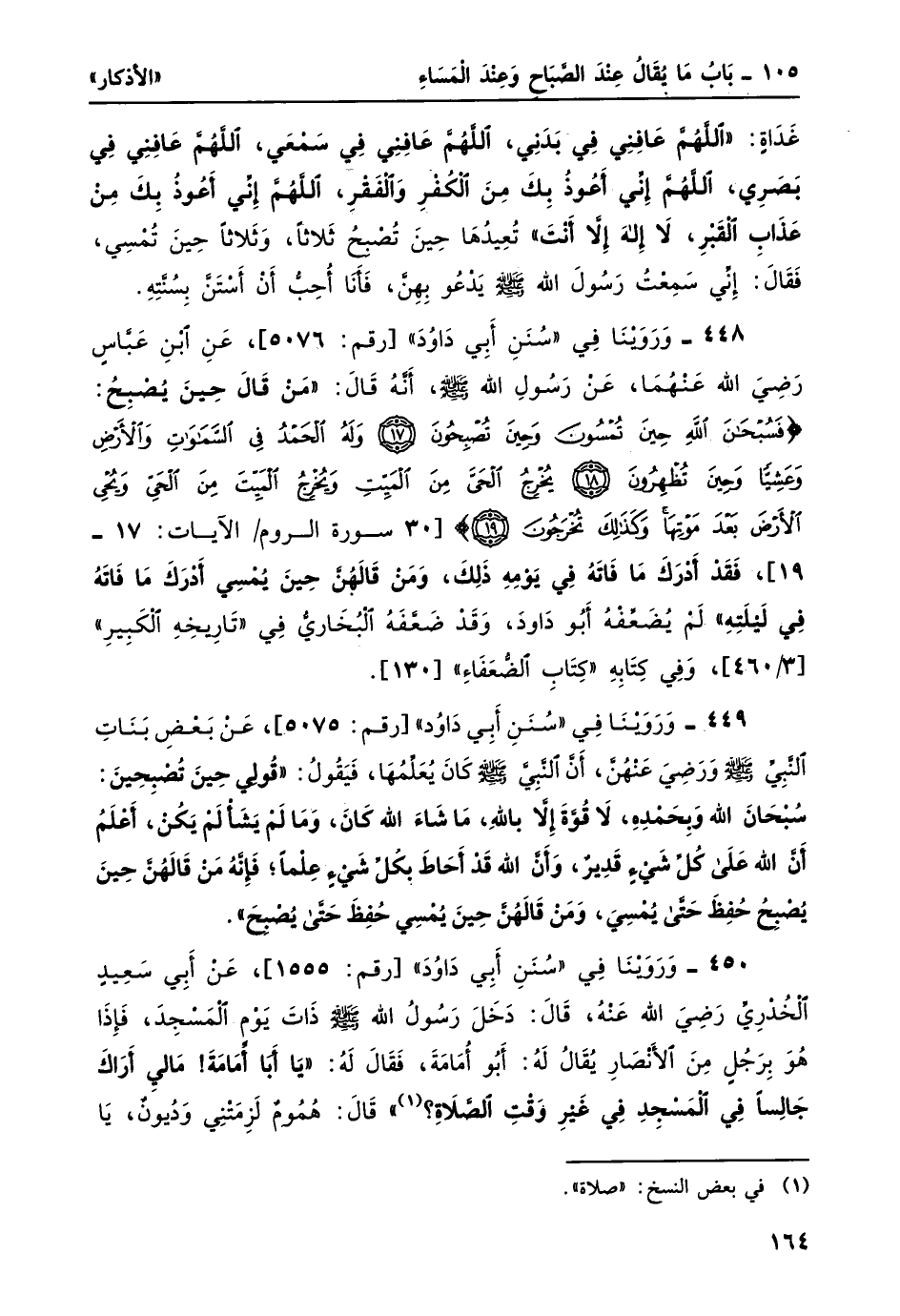 448- وروينا في "سنن أبي داود" [رقم: 5076] ، عن ابن عباس رضي الله عنهما، عن رسول الله -صلى الله عليه وسلم- أنه قال: "مَنْ قالَ حِينَ يُصْبحُ: {فَسُبْحَانَ اللَّهِ حِينَ تُمْسُونَ وَحِينَ تُصْبِحُونَ وَلَهُ الْحَمْدُ فِي السَّمَوَاتِ وَالْأَرْضِ وَعَشِيّاً وَحِينَ تُظْهِرُونَ يُخْرِجُ الْحَيَّ مِنَ الْمَيِّتِ وَيُخْرِجُ الْمَيِّتَ مِنَ الْحَيِّ وَيُحْيِي الْأَرْضَ بَعْدَ مَوْتِهَا وَكَذَلِكَ تُخْرَجُونَ} [الروم: 17 - 19] ، فقد أدرك ما فاتَهُ فِي يَوْمِهِ ذلكَ، وَمَنْ قالَهُنَّ حِينَ يُمْسِي أَدْرَكَ ما فَاتَهُ في لَيْلَتِهِ" لم يُضَعِّفه أبو داود، وقد ضعفه البخاري في "تاريخه الكبير" [460/3] ، وفي كتابه "كتاب الضعفاء" [130] .