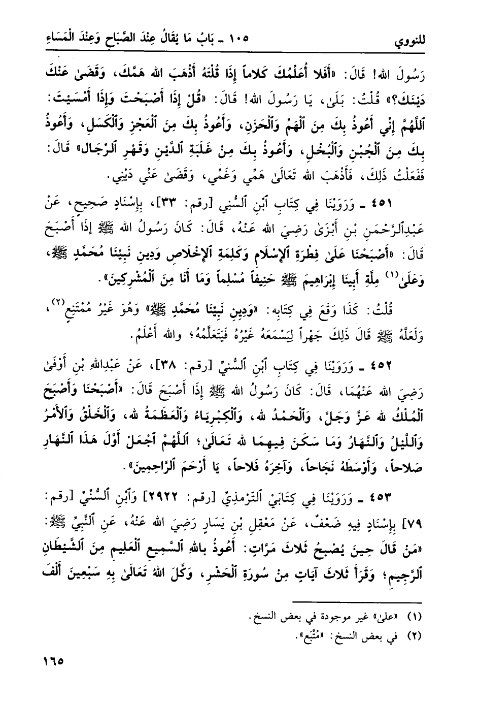 451- وروينا في كتاب ابن السني [رقم: 33] ، بإسناد صحيح، عن عبد الرحمن بن أبزى رضي الله عنه، قال: كان رسول الله -صلى الله عليه وسلم- إذا أصبح قال: "أصْبَحْنَا على فِطْرَةِ الإِسْلامِ وكَلِمَةِ الإِخْلاصِ ودين نبيّنا محمّدٌ -صلى الله عليه وسلم- وعلى 1 ملة أبينا إِبْرَاهِيمَ -صلى الله عليه وسلم- حَنِيفاً مُسْلِماً ومَا أنا مِنَ المُشْرِكِينَ".