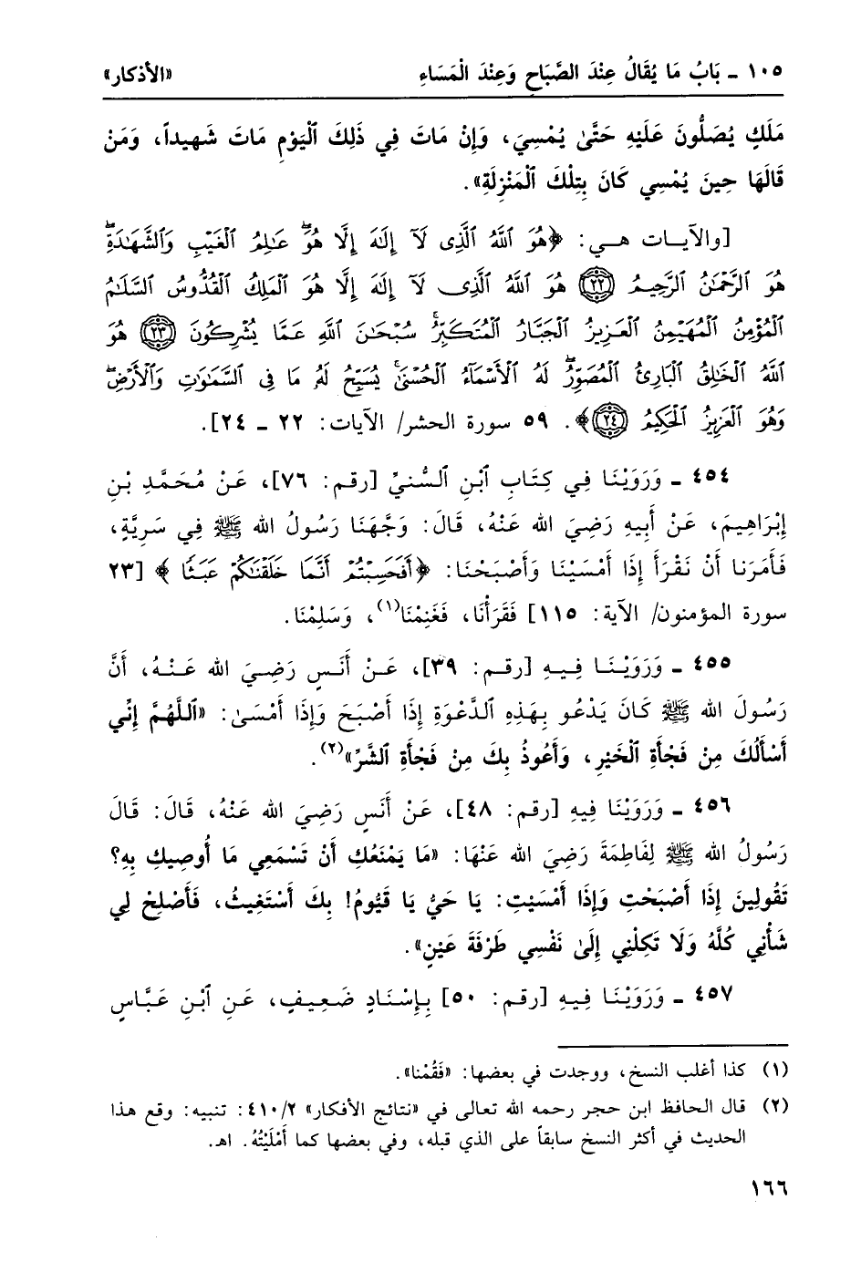 454- وروينا في كتاب ابن السني [رقم: 76] ، عن محمد بن إبراهيم، عن أبيه رضي الله عنه، قال: وجّهَنَا رسولُ الله -صلى الله عليه وسلم- في سرية، فأمَرَنَا أن نقرأ إذا أمسينا وأصبحنا: {أَفَحَسِبْتُمْ أَنَّمَا خَلَقْنَاكُمْ عَبَثاً} [المؤمنون: 115] فقرأنا، فغنمنا1، وسلمنا.
