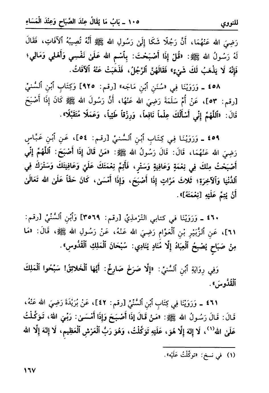 459- وروينا في كتاب ابن السني [رقم: 54] ، عن ابن عباس رضي الله عنهما، قال: قال رسول الله صلى الله عليه وسلم: "من قال إذَا أصْبَحَ: اللَّهُمَّ إني أصْبَحُتُ منْكَ في نِعْمَةٍ وَعافِيَةٍ وَسَتْرٍ، فأتِمَّ نِعْمَتَكَ عَليَّ وَعَافِيَتَكَ وَسَتْرَكَ فِي الدُّنْيا والآخِرَةِ؛ ثَلاثَ مراتٍ إِذَا أصْبَحَ، وَإِذَا أَمْسَى، كان حَقّاً على اللَّهِ تَعالى أنْ يُتِمَّ عَلَيْهِ [نعمته] ".