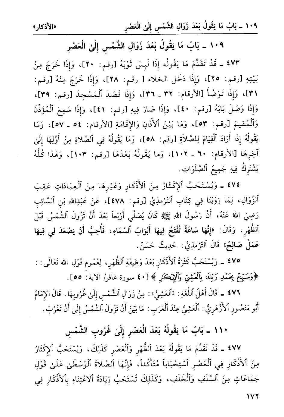 475- ويُستحبّ كثرةُ الأذكار بعد وظيفة الظهر، لعموم قول الله تعال: {وَسَبِّحْ بِحَمْدِ رَبِّكَ بِالْعَشِيِّ وَالْإِبْكَارِ} [غافر: 55] .