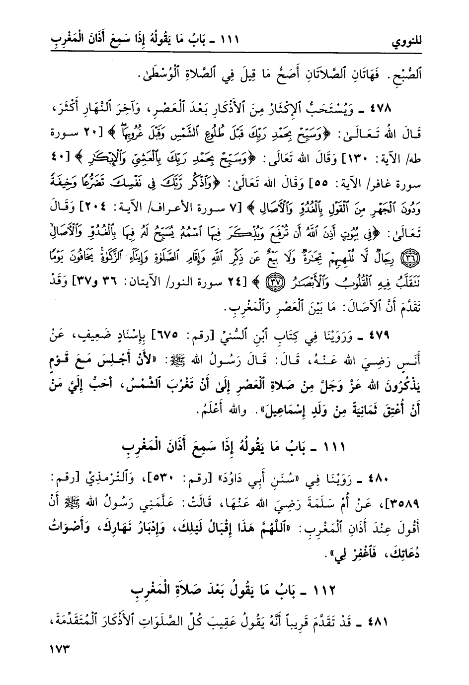 477- قد تقدم ما يقولُه بعدَ الظهر والعصر كذلك، ويُستحبُّ الإِكثارُ من الأذكار في العصر استحباباً متأكداً، فإنها الصلاة الوسطى على قول جماعات من السلف والخلف، وكذلك تُستحبُّ زيادةُ الاعتناء بالأذكار في
