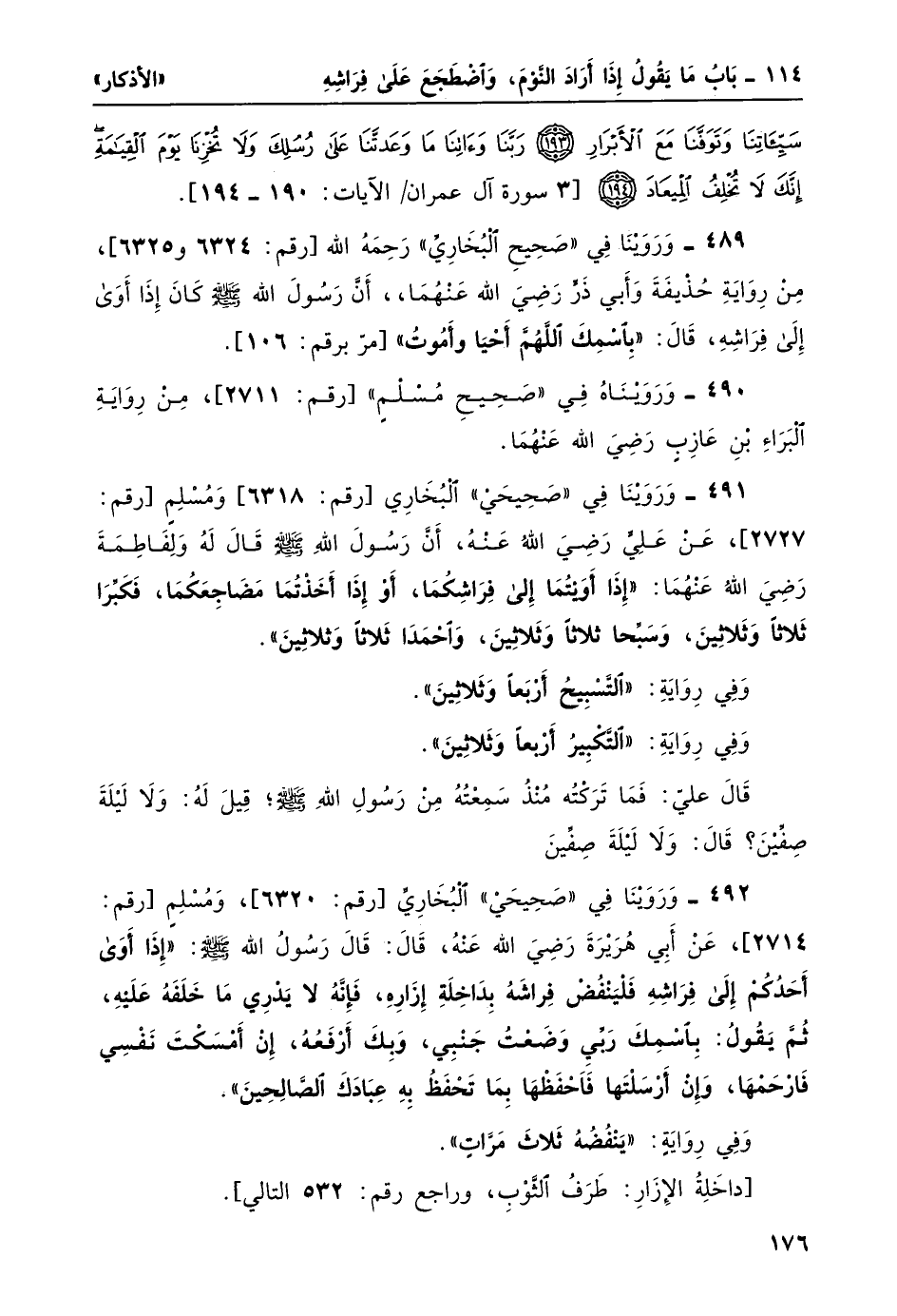 491- وروينا في "صحيحي" البخاري [رقم: 6318] ومسلم [رقم: 2727] ، عن عليّ رضي الله عنه، أن رسول الله -صلى الله عليه وسلم- قال له ولفاطمة رضي الله عنهما: "إذَا أوَيْتُما إلى فِرَاشِكُما، أوْ إذَا أخَذْتُما مَضَاجِعَكُما، فَكَبِّرَا ثَلاثاً وَثَلاثِينَ، وَسَبِّحا ثَلاثاً وثَلاثِينَ، وَاحْمَدَا ثَلاَثاً وَثَلاثِينَ".