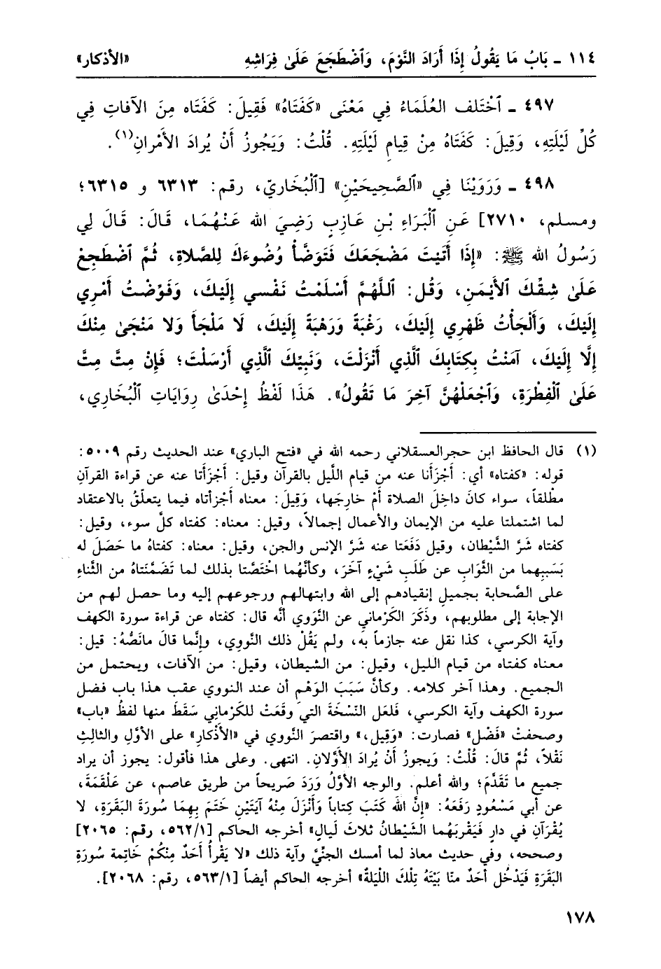 498- وروينا في "الصحيحين" [البخاري، رقم: 6313 و6315؛ ومسلم، 2710] عن البراء بن عازب رضي الله عنهما، قال: قال لي رسول الله صلى الله عليه وسلم: "إذا أتَيْتَ مَضْجَعَكَ فَتَوَضَّأَ وُضُوءَكَ لِلصَّلاةِ، ثُمَّ اضْطَجِعْ على شِقِكَ الأيْمَنِ، وقُل: اللَّهُمَّ أسْلَمْتُ نَفْسِي إِلَيْكَ، وَفَوَّضْتُ أمْرِي إِلَيْكَ، وَألجأْتُ ظَهْرِي إِلَيْكَ، رَغْبَةَ وَرَهْبَةً إِلَيْكَ، لا ملجأ وَلا مَنْجَى مِنْكَ إِلاَّ إِليْكَ، آمَنْتُ بِكِتابِكَ الَّذي أنْزَلْتَ، وَنَبِيِّكَ الَّذي أَرْسَلْتَ؛ فإنْ مِتَّ مِتَّ على الفِطْرَةِ، واجْعَلْهُنَّ آخِرَ ما تَقُولُ". هذا لفظ إحدى روايات البخاري،